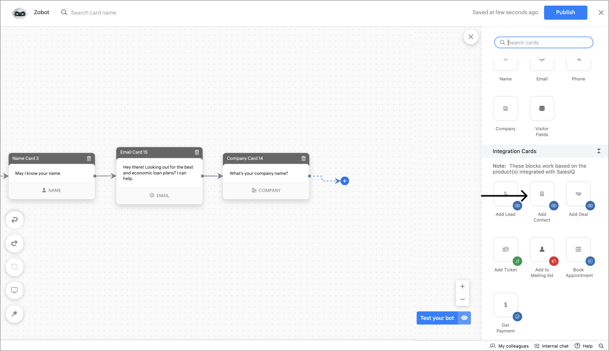 - To add the card to the flow, click on the cardholder icon (+) and choose Add Contact under the Integration Card section.