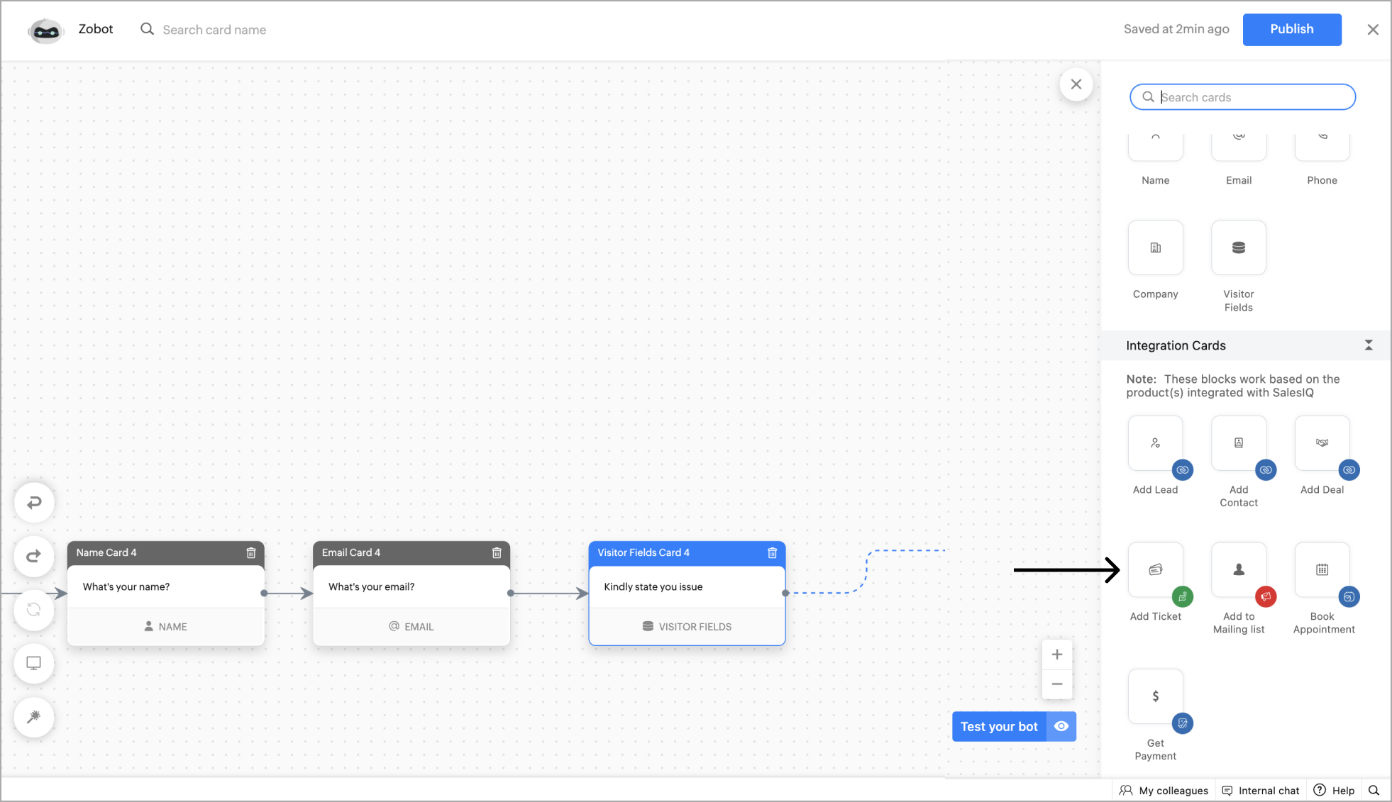 This card can be used to create a desk ticket for the visitor. To use this card, Zoho Desk integration is mandatory.