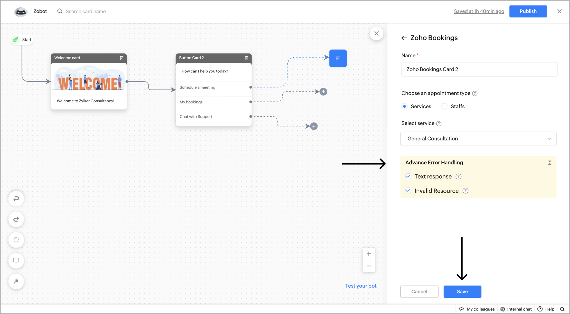 - Inside the Advance Error Handling section, you can handle cases like when the integration is inactive, invalid desk department, or invalid ticket assignee. Click Save.