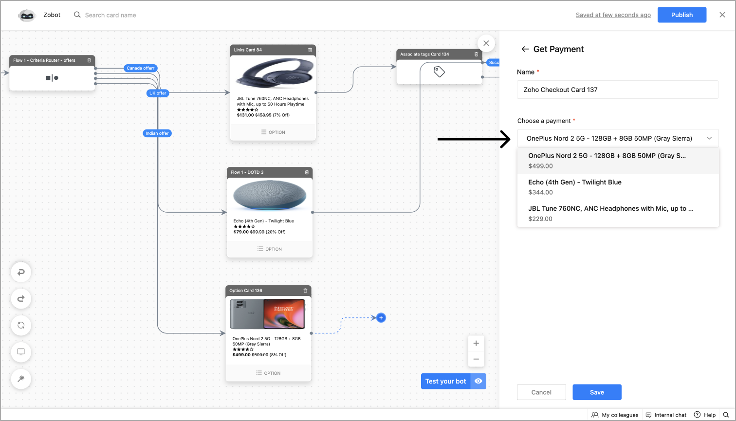 - To add the card to the flow, click on the cardholder icon (+) and choose Get Payment under the Integration Cards section.