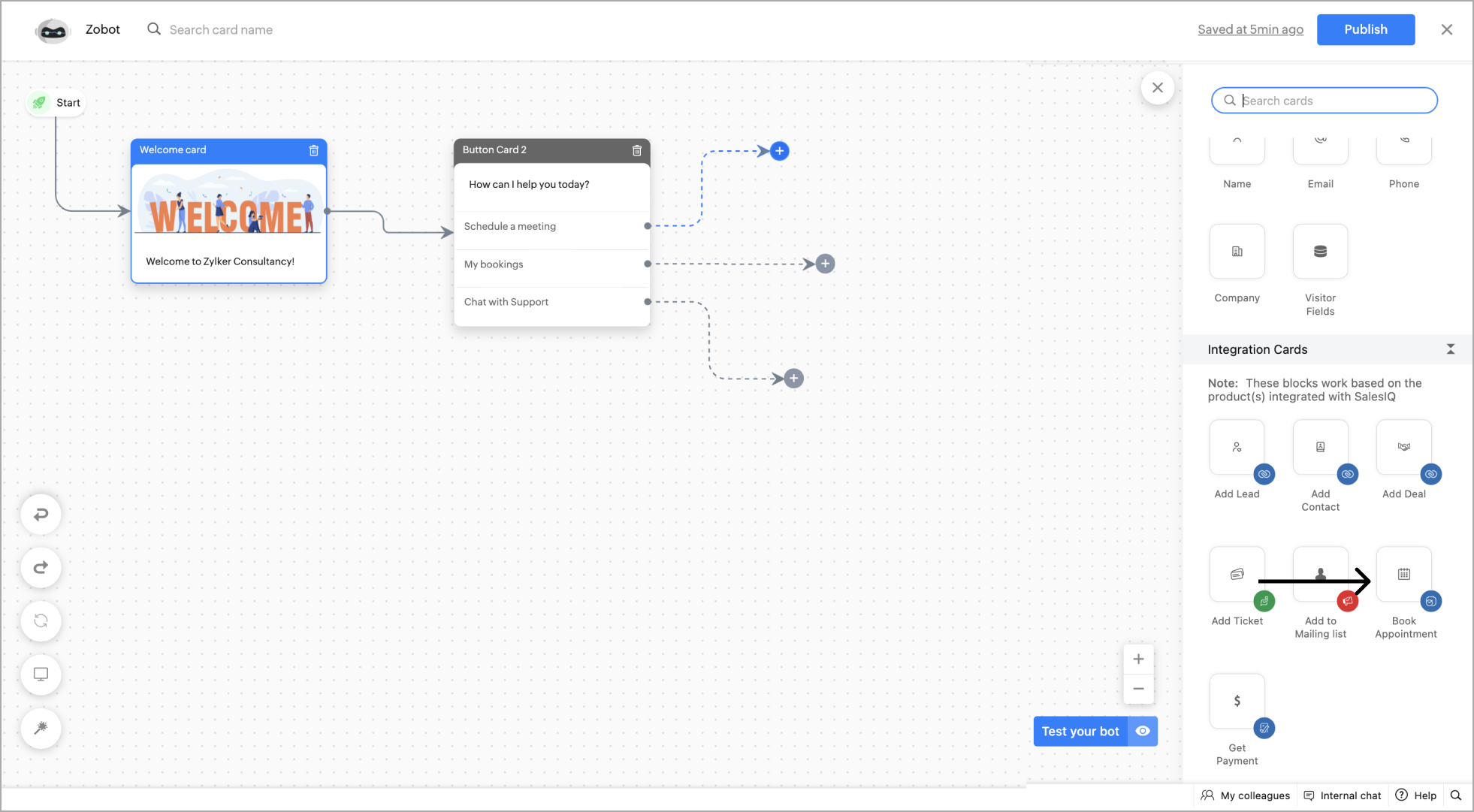 - To add the card to the flow, click on the cardholder icon (+) and choose Book Appointment card under the Integration Card section.