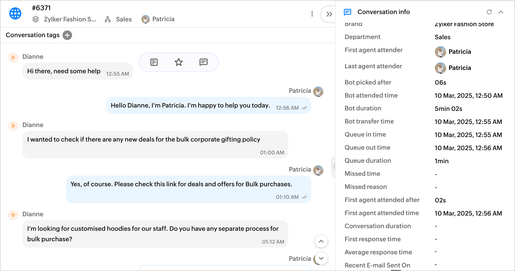Note: Certain conversation information (response metrics) including conversation duration, first response time, average response time, and recent email sent are not available for active chats. These metrics are calculated only after the chat has ended.