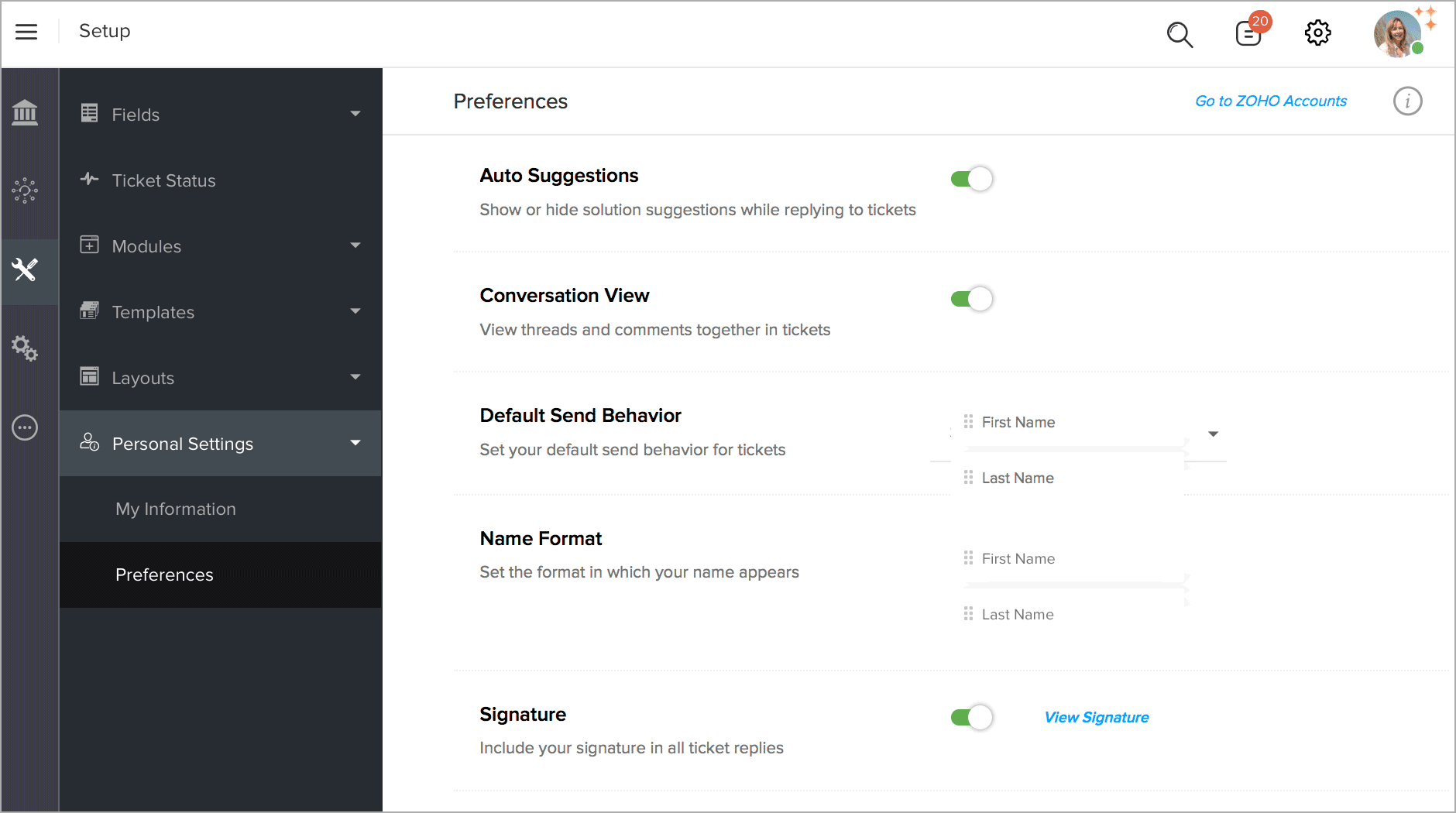 1. In Zoho Desk, goto Setup >  Customize > Personal Settings >  Preferences > Signatures > View Signature .