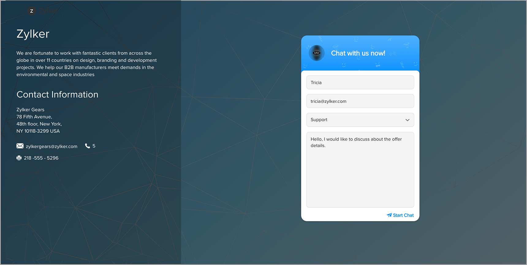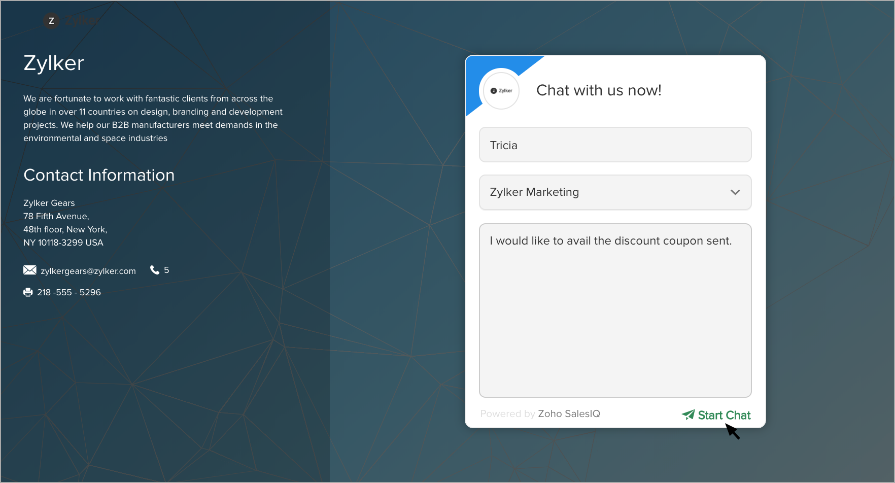 Once your Email recipient has entered all the required fields, with the required question they can initiate a chat to you directly from the signature chat page. However, you should be logged in to Zoho SalesIQ web or mobile app to get notification and reply back.