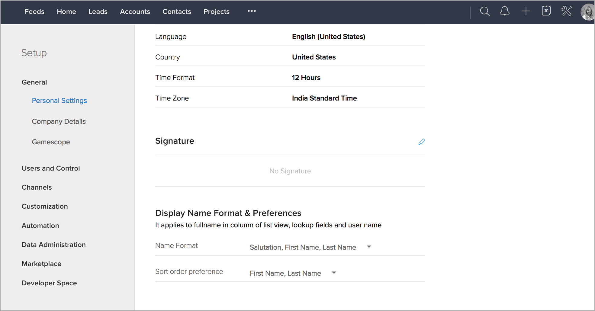 1. In Zoho CRM, go to Setup >  General > Personal Settings >  Signature.