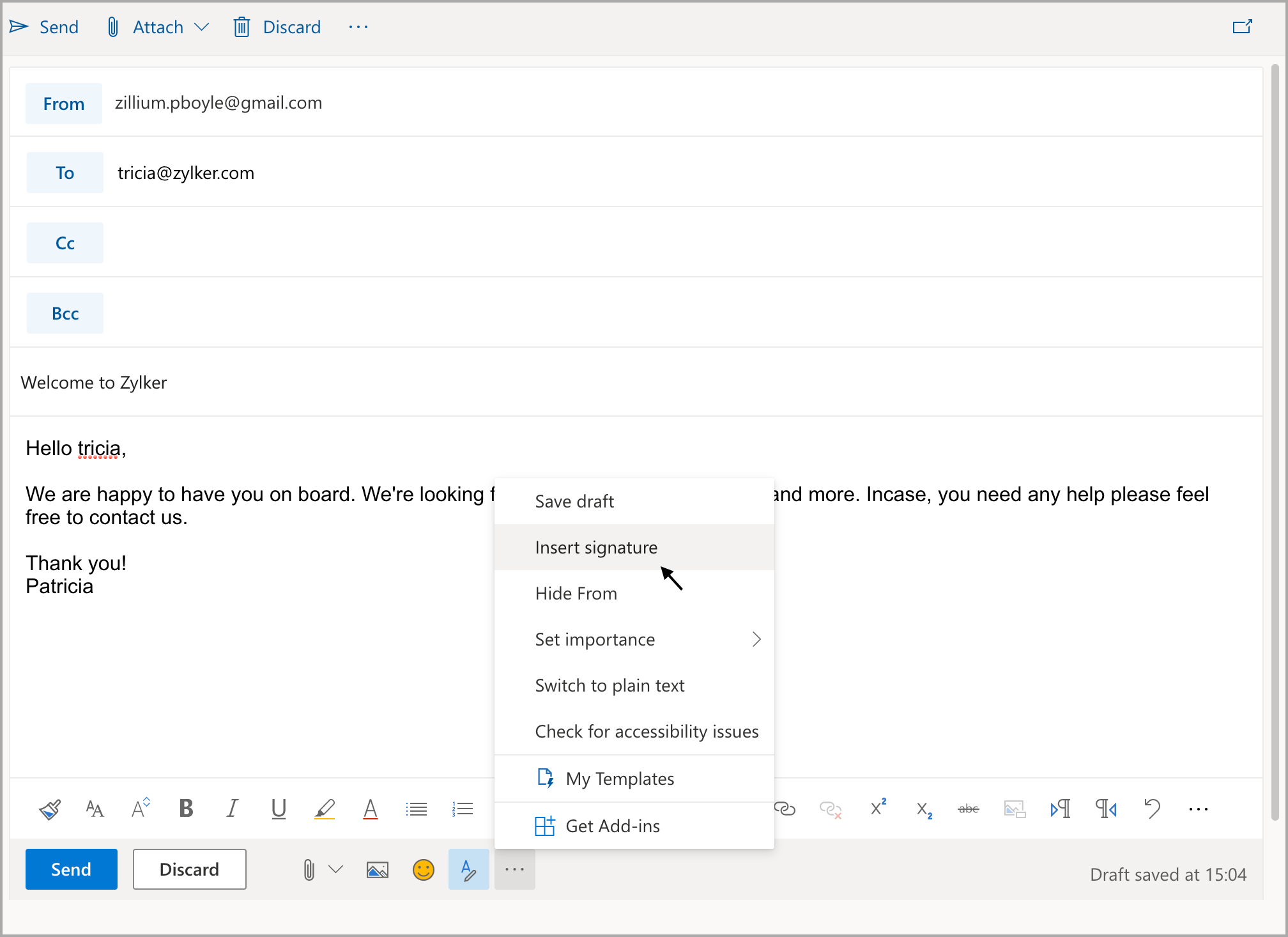 1. Now, when composing your email. Click More options icon at the bottom and Insert the Signature at the end before sending the email.