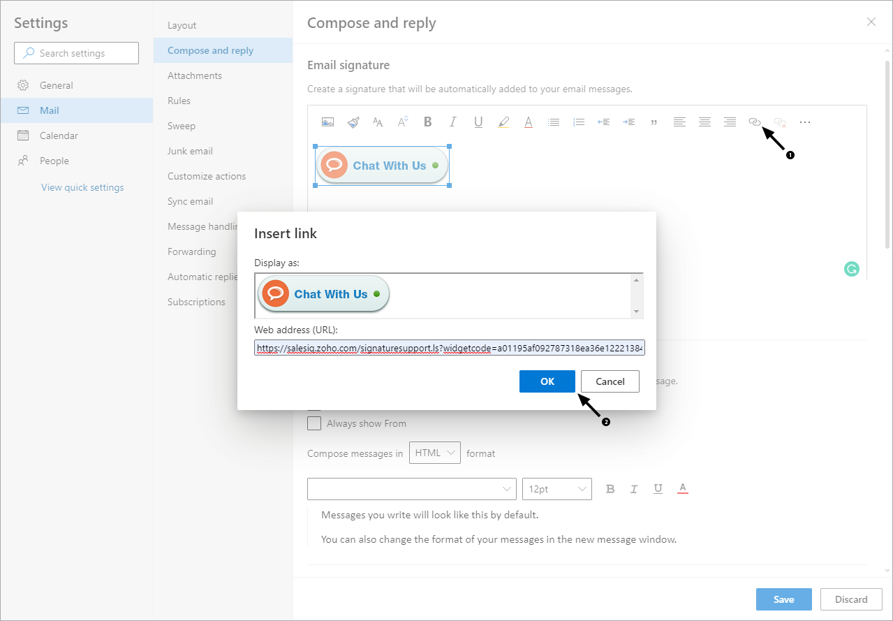Add Zoho SalesIQ Signature chat in your reply emails sent from Microsoft Outlook, and swiftly get connected with your customers in real time.