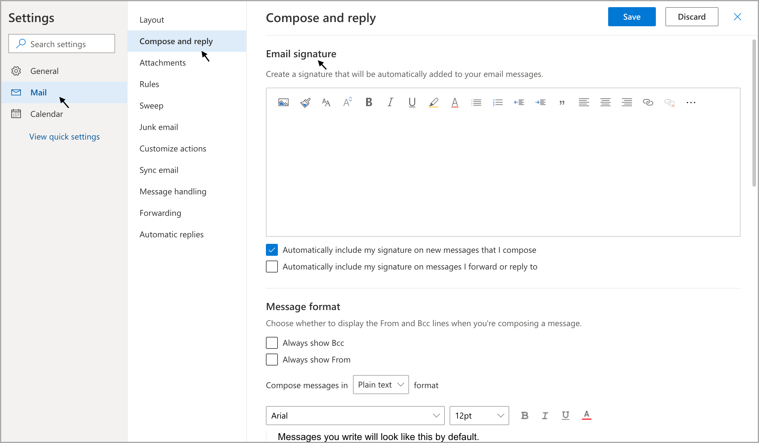 1. In Microsoft Outlook, click Settings icon >View all Outlook settings > Mail >Compose and reply.