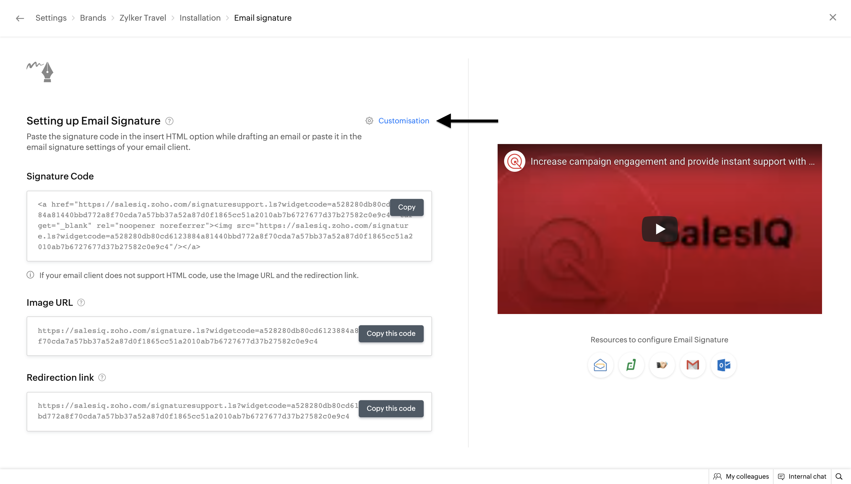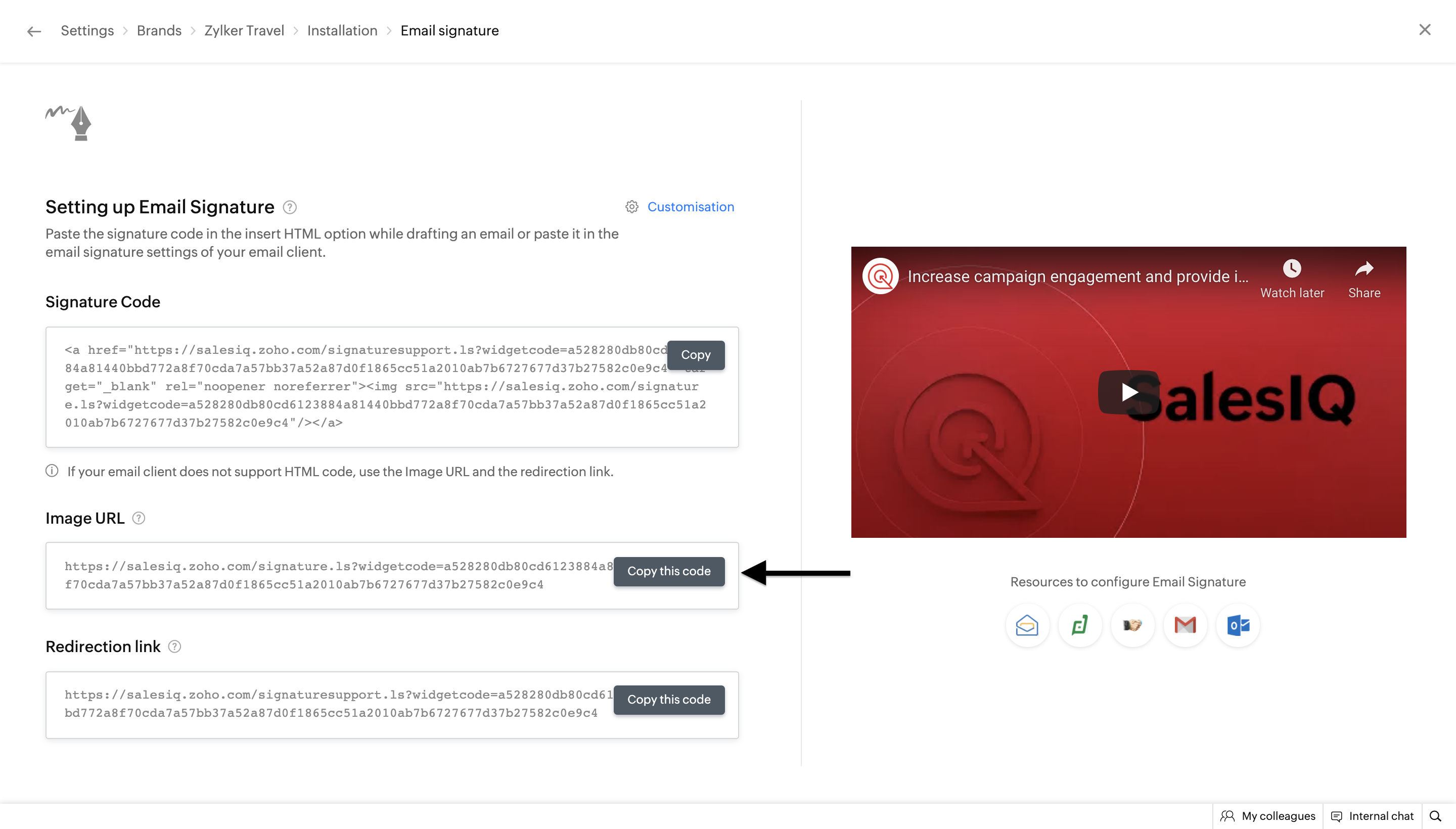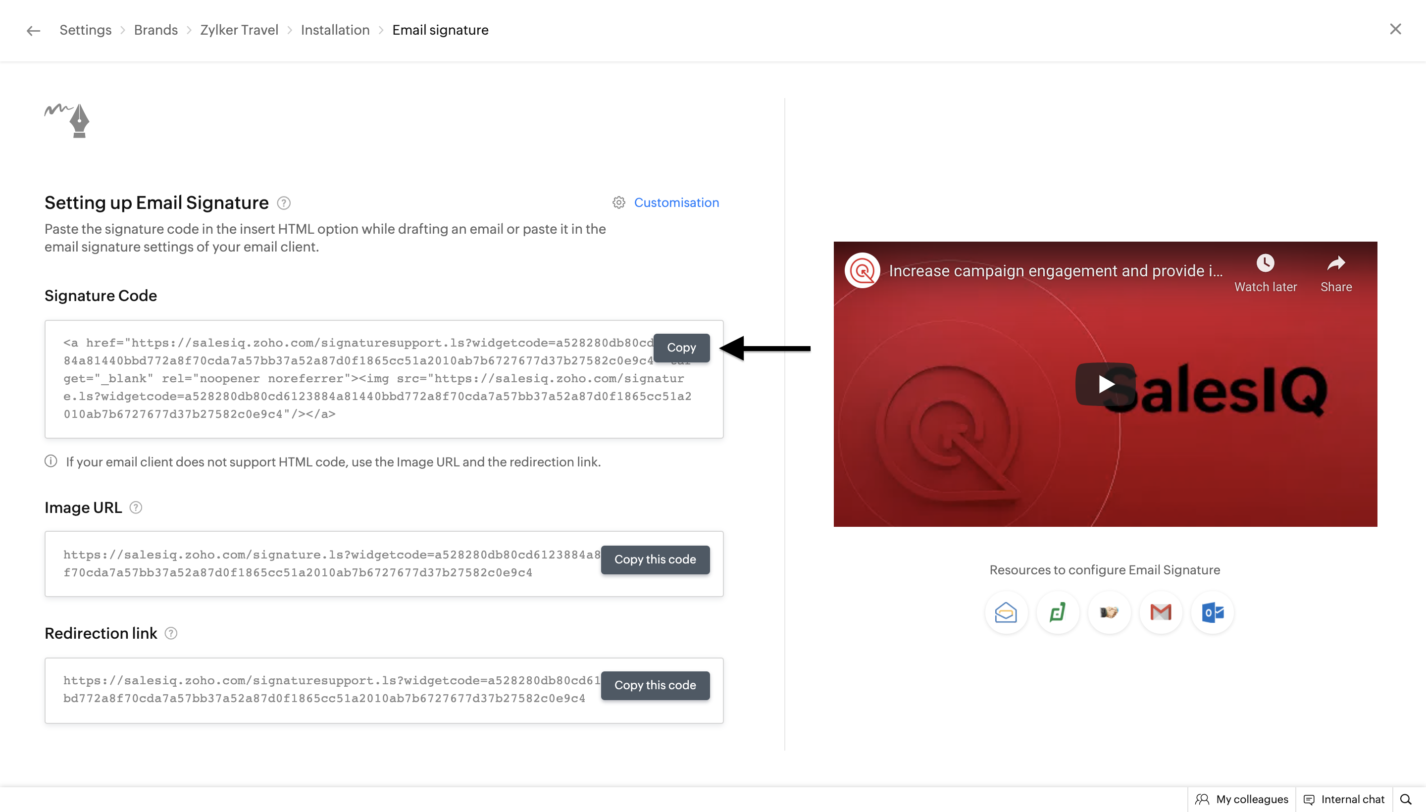 3. Now, copy the signature chat code from the  Settings > Personalize > Brands > Brand name >  Installation  > Email Signature   section.