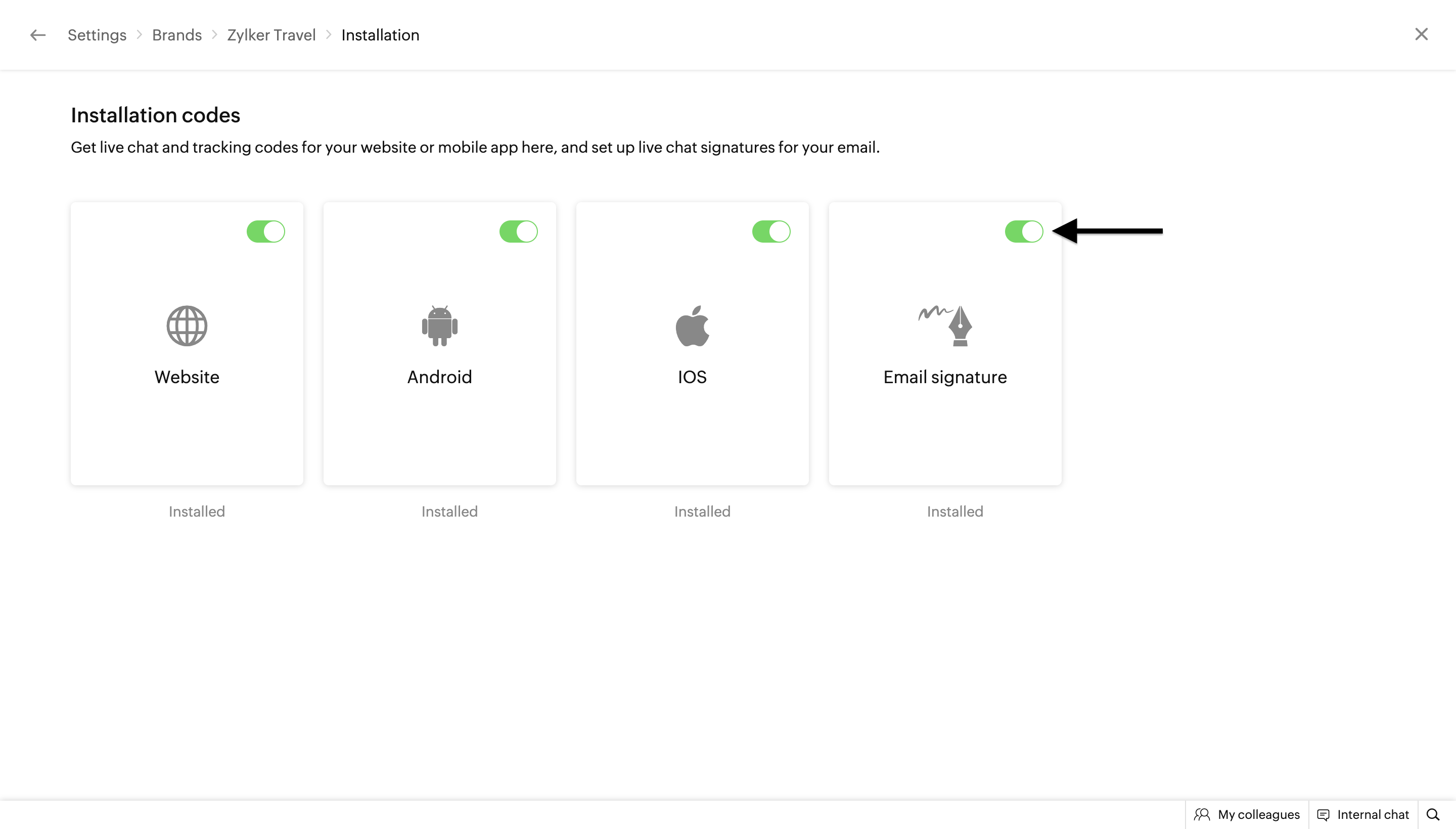 1. In the Zoho SalesIQ dashboard, go to  Settings > Personalize > Brands > Brand name > Installation > Email Signature .