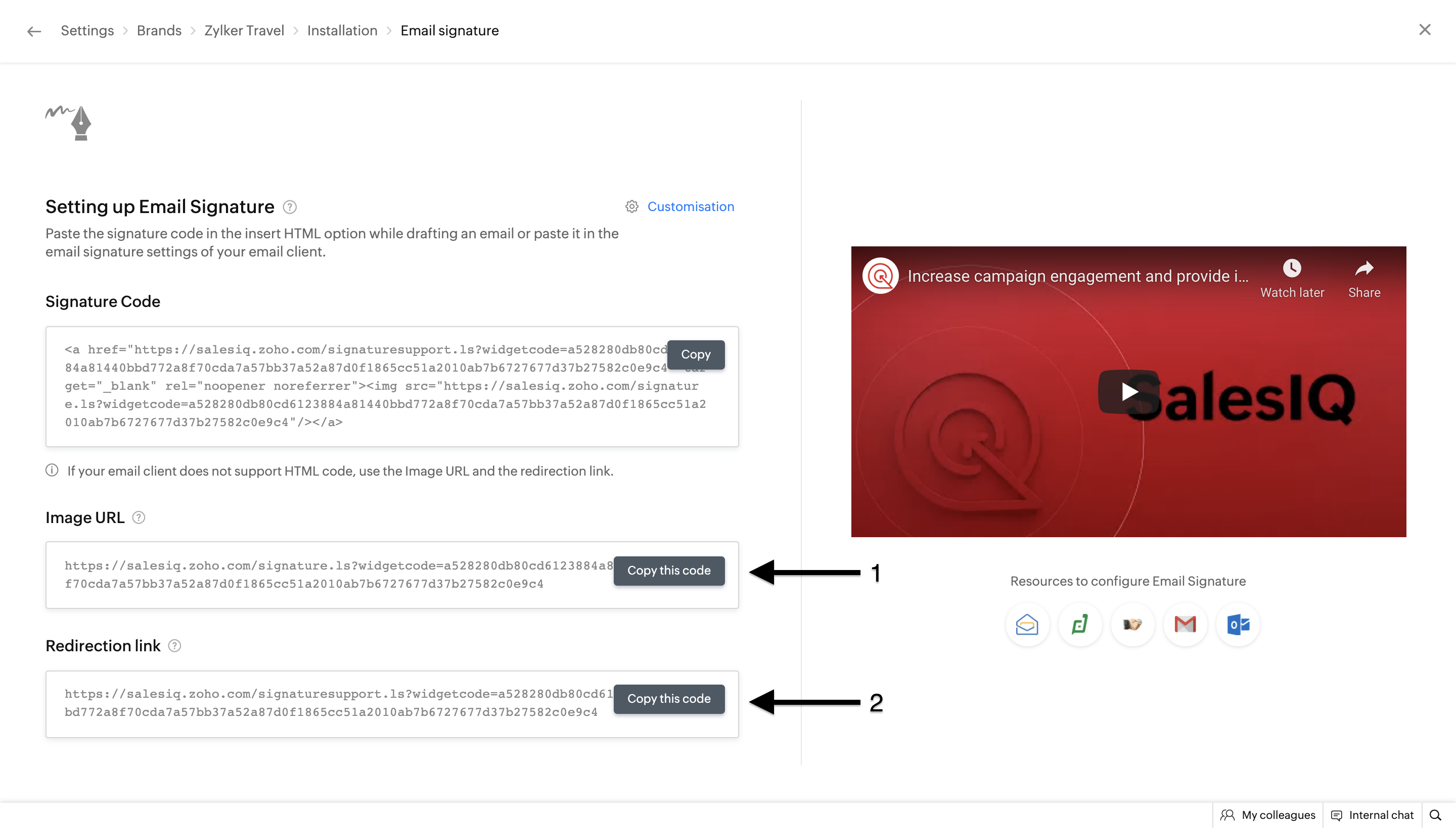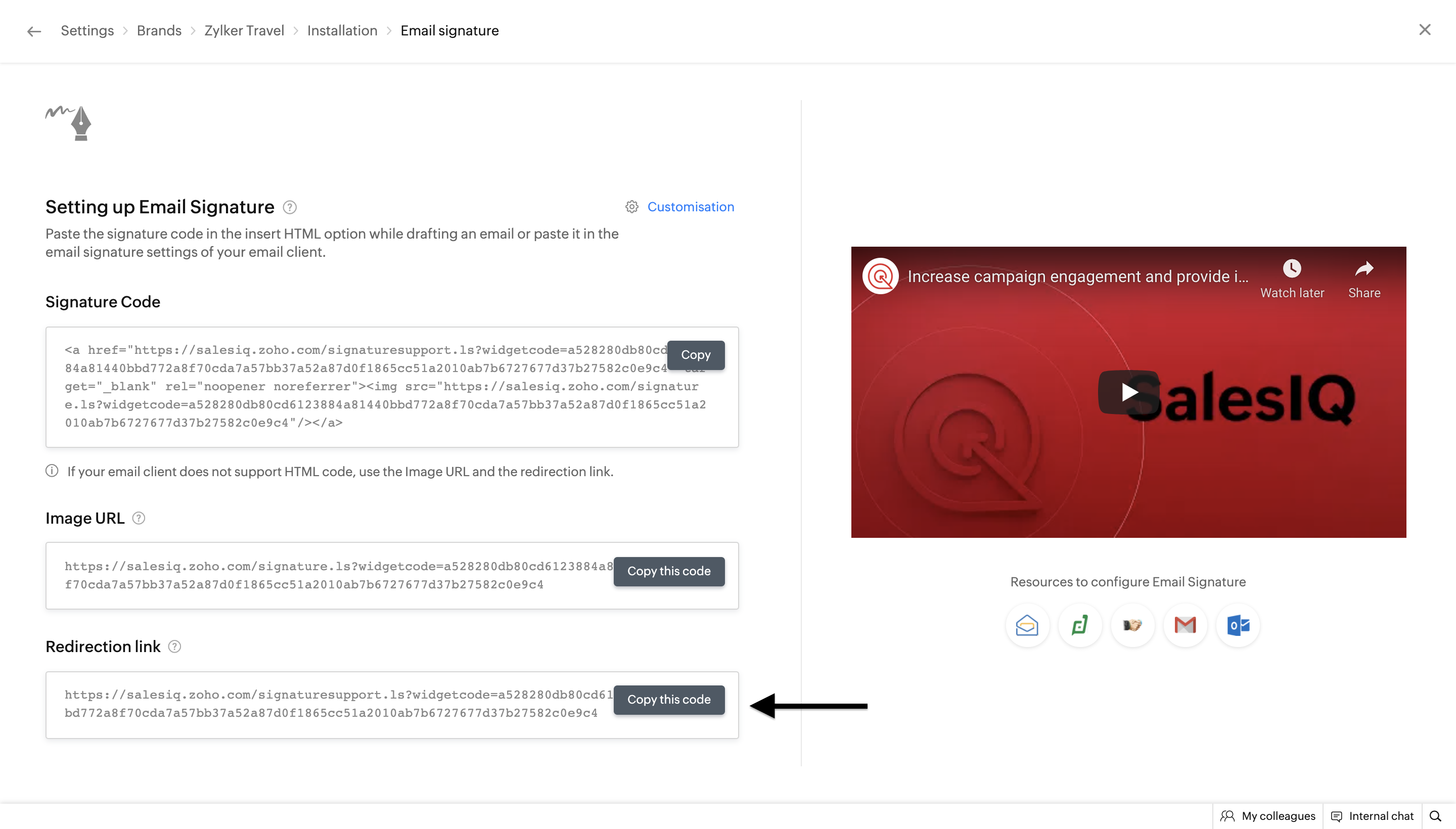 6. Now, copy the signature chat code from the  Settings > Personalize > Brands > Brand name >  Installation  > Email Signature   section.