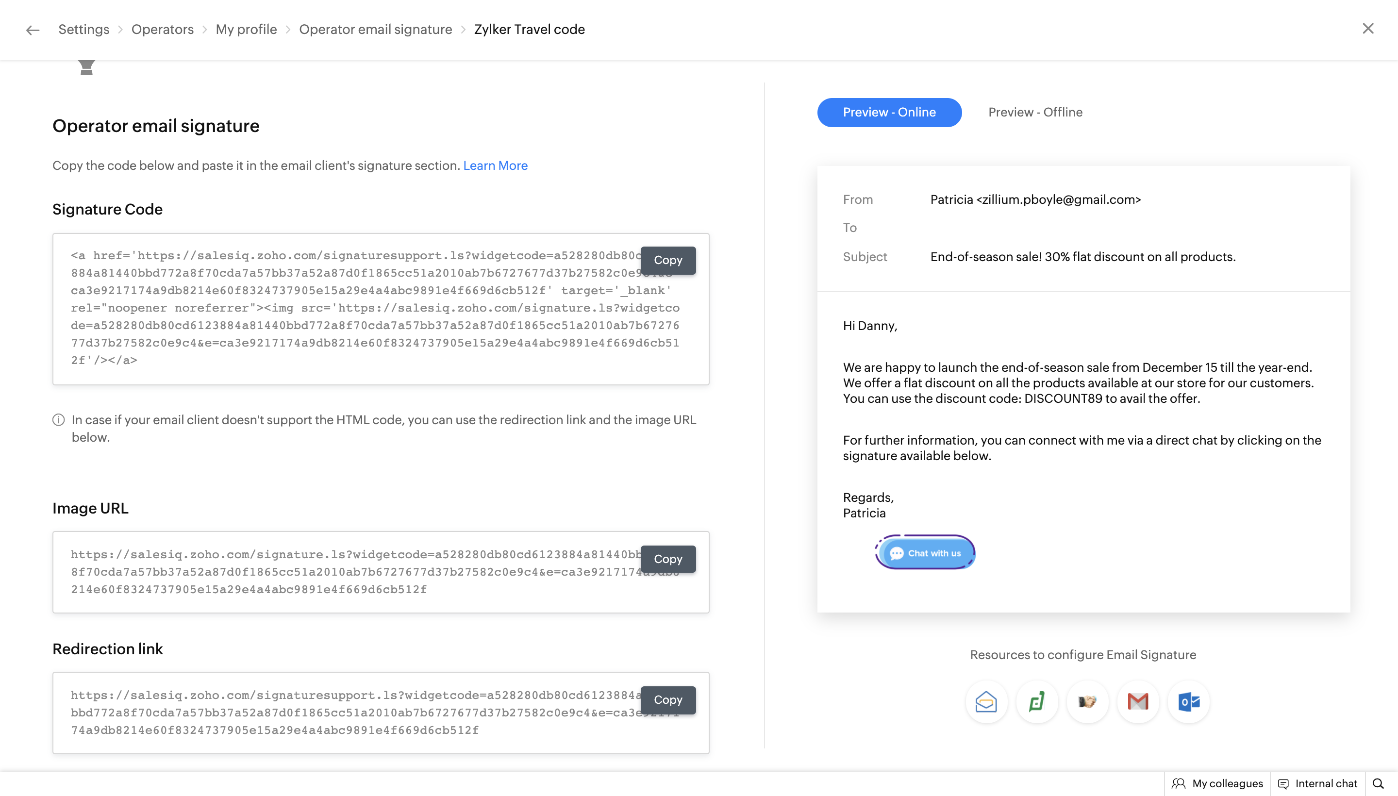 You can use this code, if your email client accepts HTML Code to get the signature from Zoho SalesIQ. You can copy and paste the unique snippet code into your right signature directories, to get the signature chat widget in the mails which you send.
