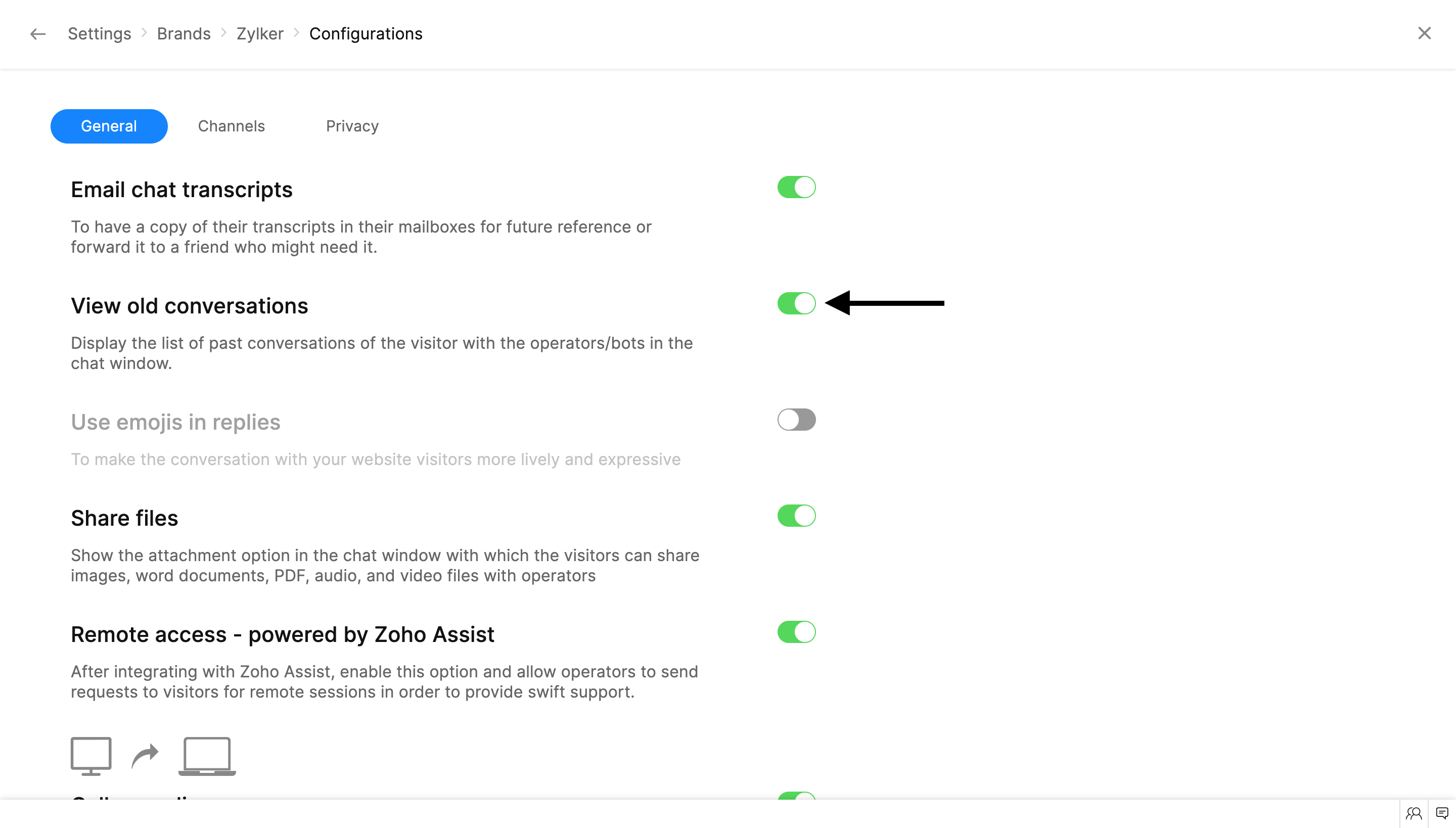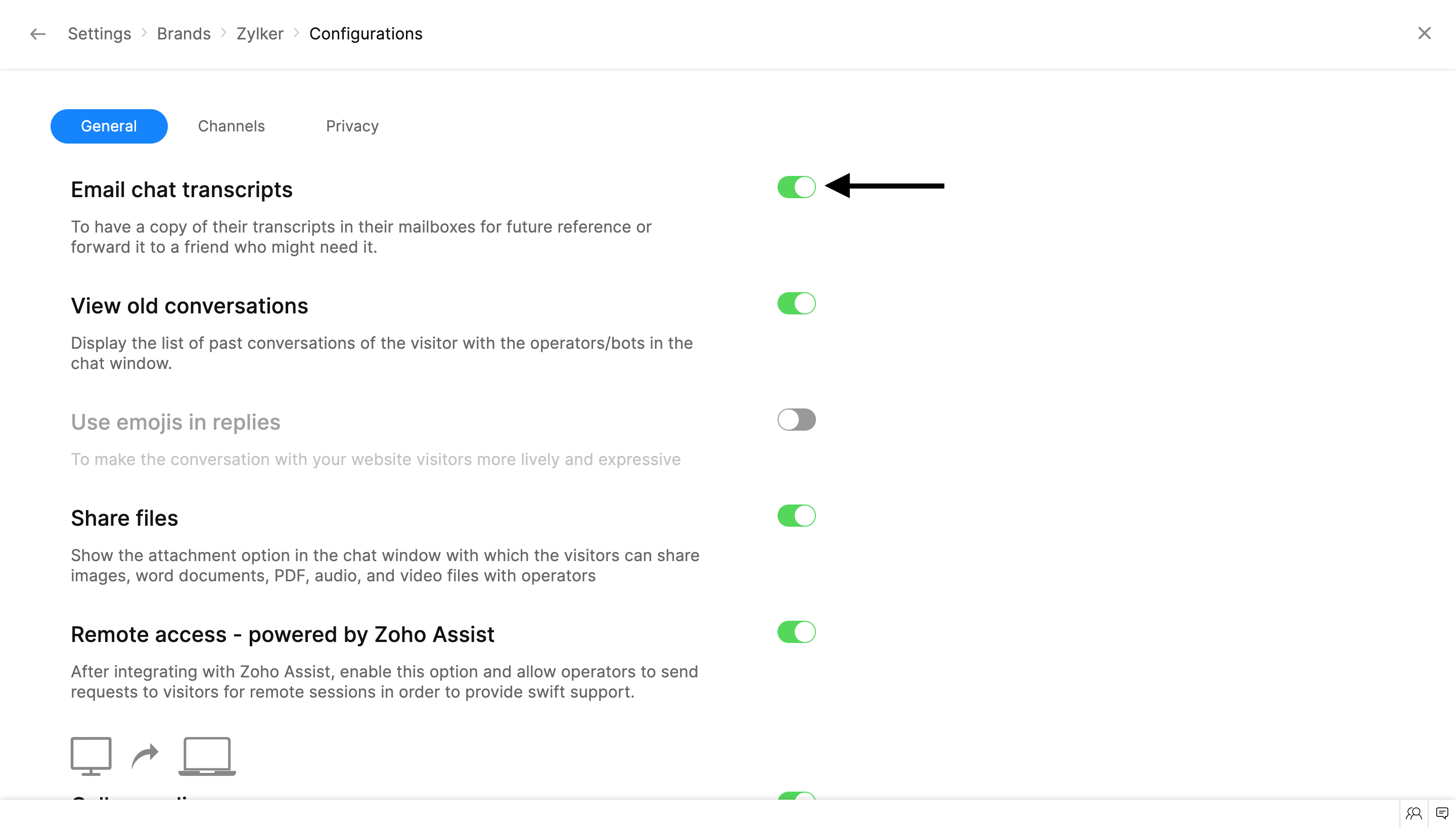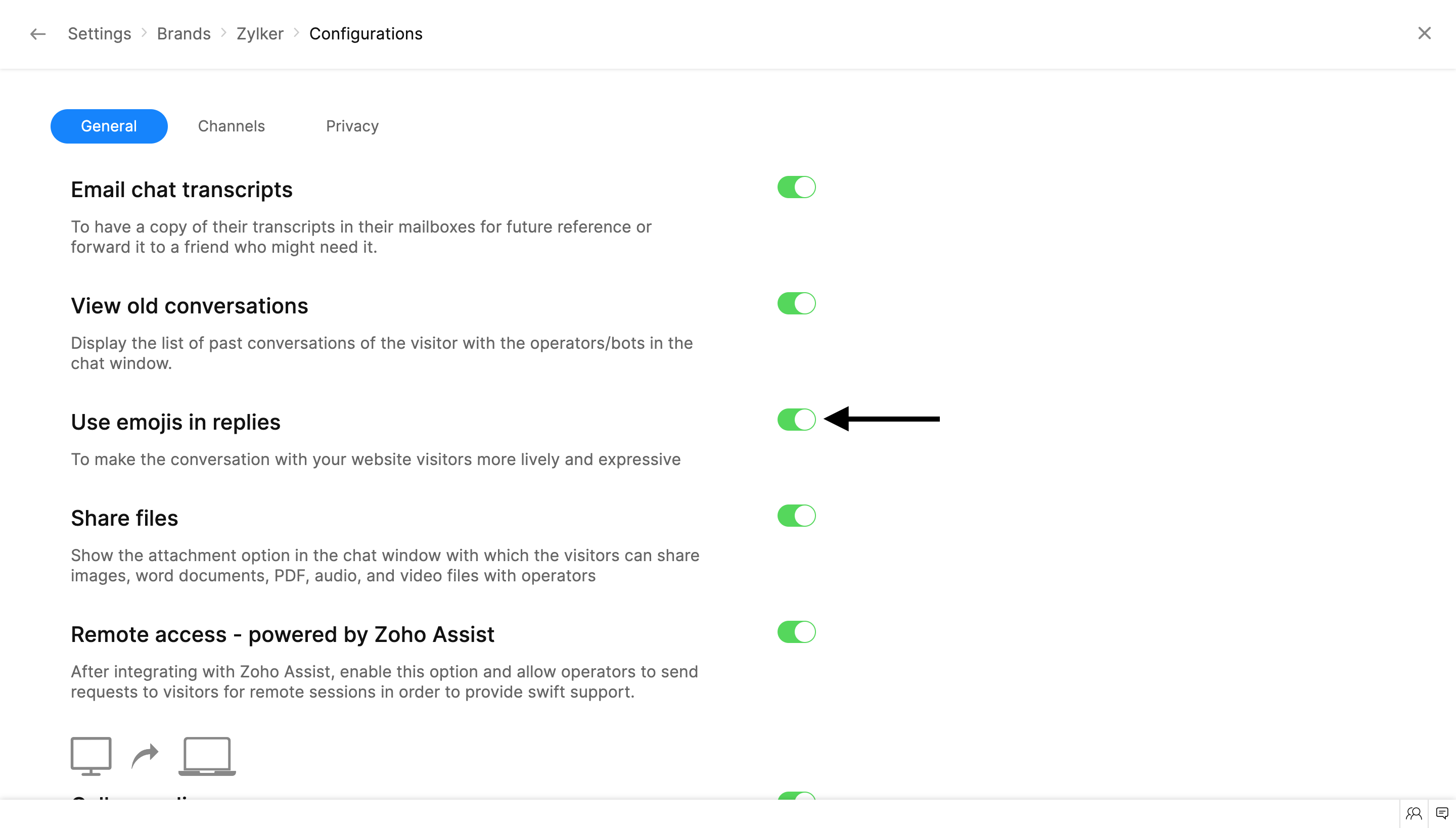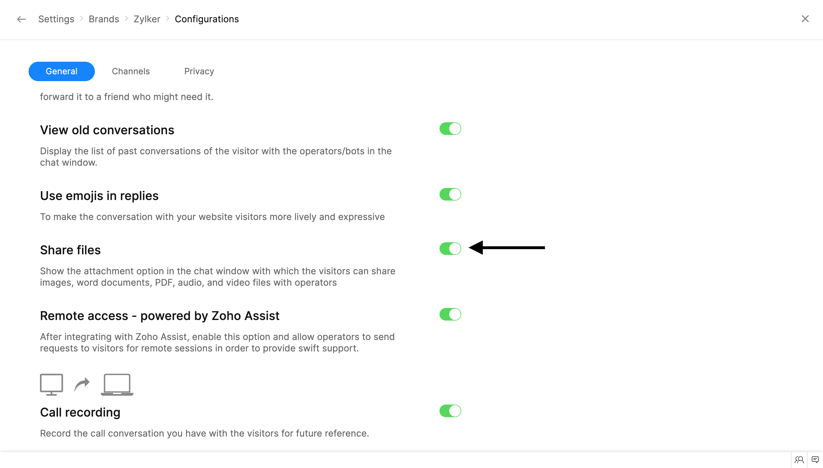 Enabling the Screen Sharing option will allow your visitors to project their screens during a conversation. This option can be used to get hands-on experience on the visitor's issues and assist them with ease.