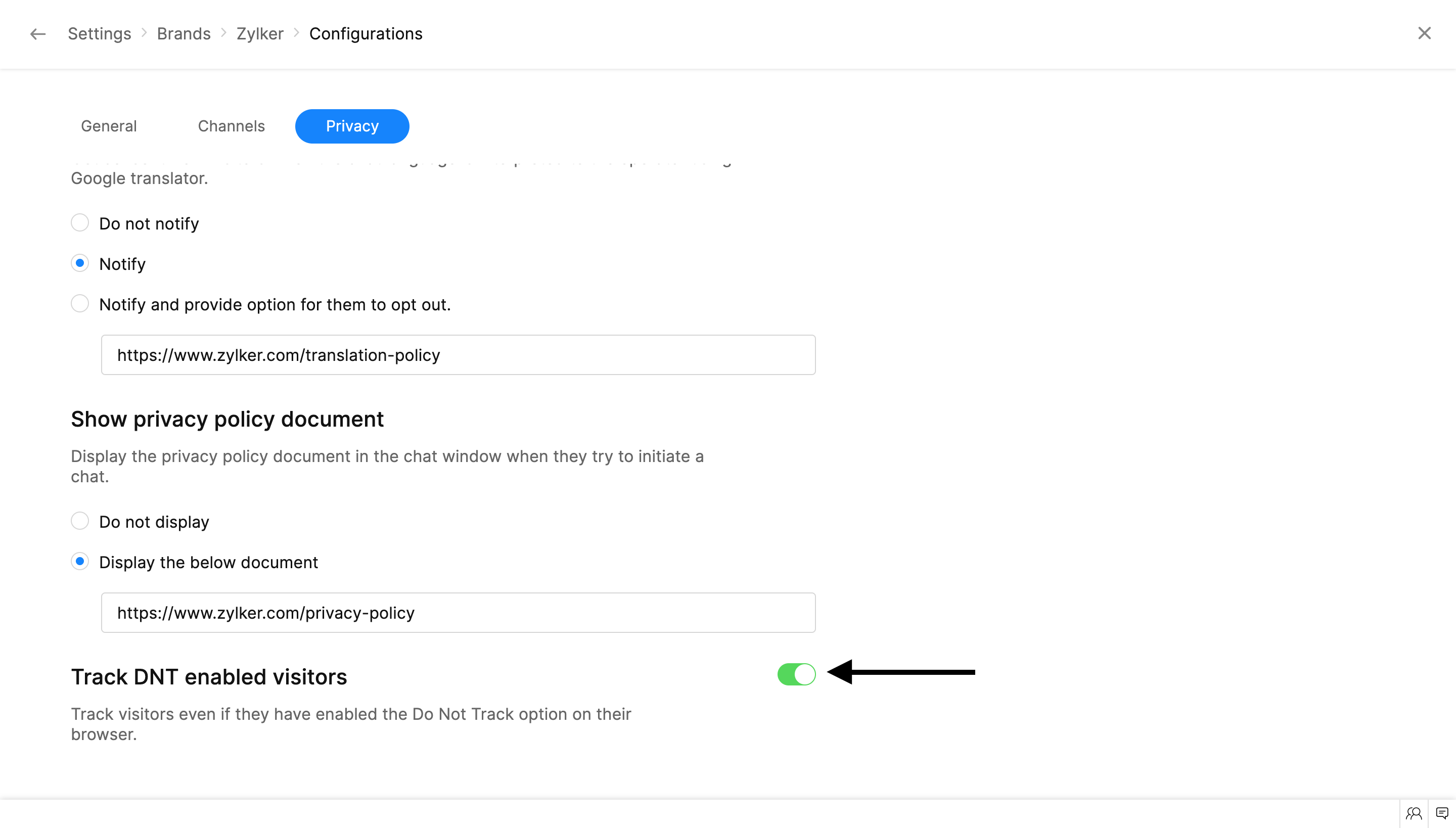 DNT or Do Not Track is a browser setting that will let visitors send a message to websites, web-apps, and other third-party advertising networks requesting not to track their personal information as they browse through various sites. SalesIQ lets you track visitor data irrespective of visitor’s DNT requests. You can avail this by enabling the Track DNT enabled visitors option.
