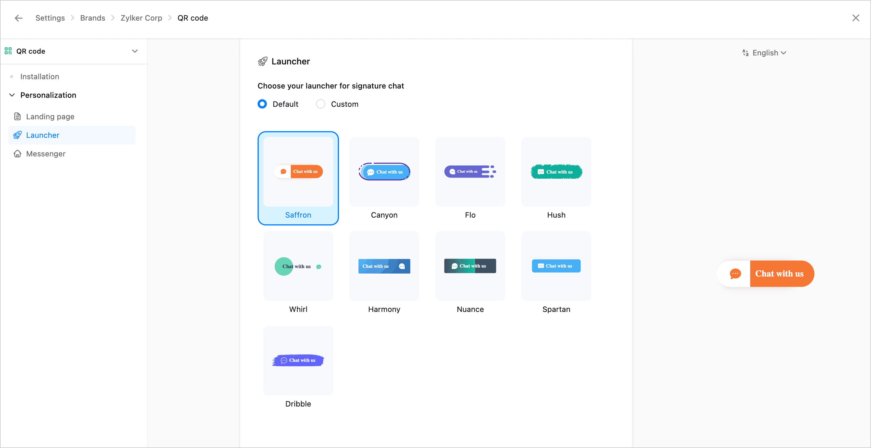 - Default launcher: By default, SalesIQ provides a set of pre-designed launcher styles for QR-based chats. These ready-made designs help you quickly set up a clean and consistent chat entry point without any additional customization.