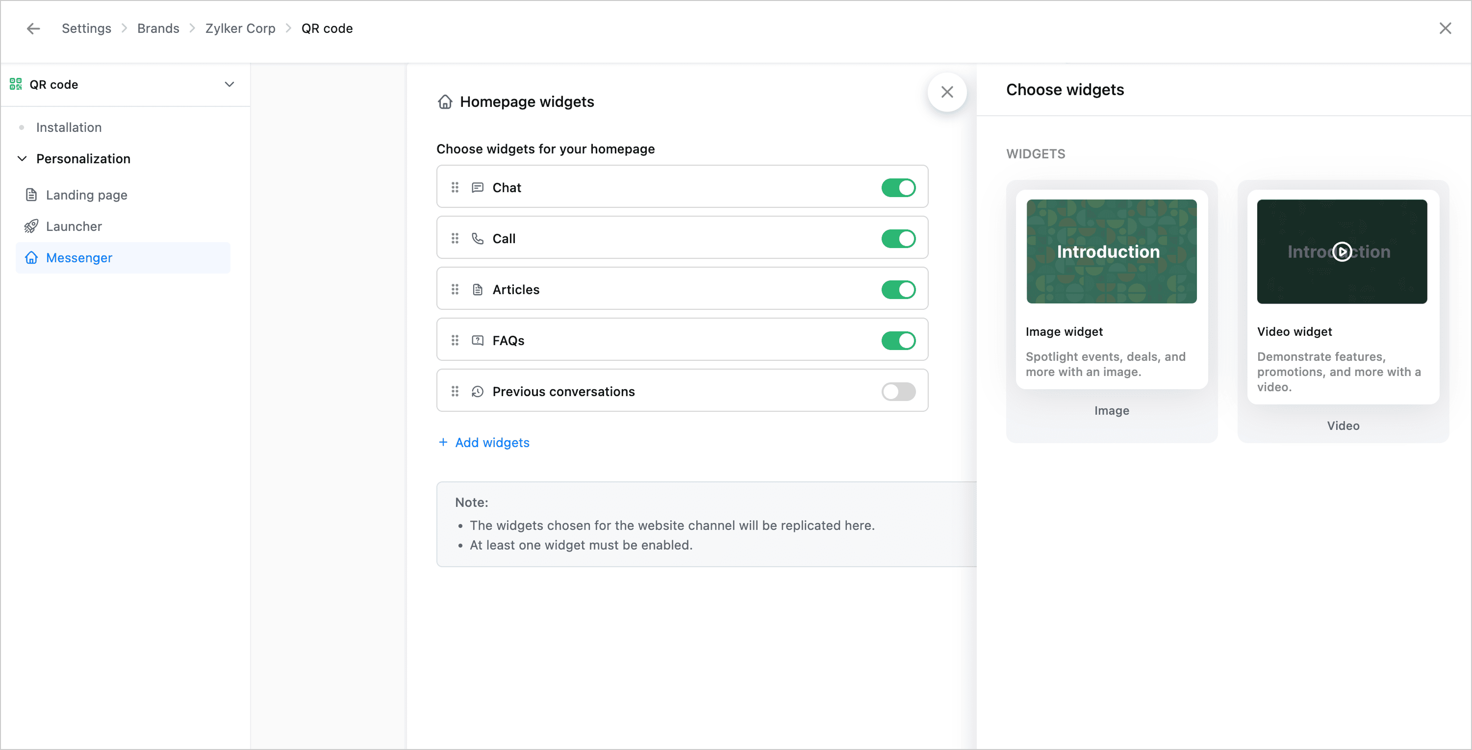 Add widgets: Select Add widgets to open a side panel where you can include additional widget types on the messenger homepage: