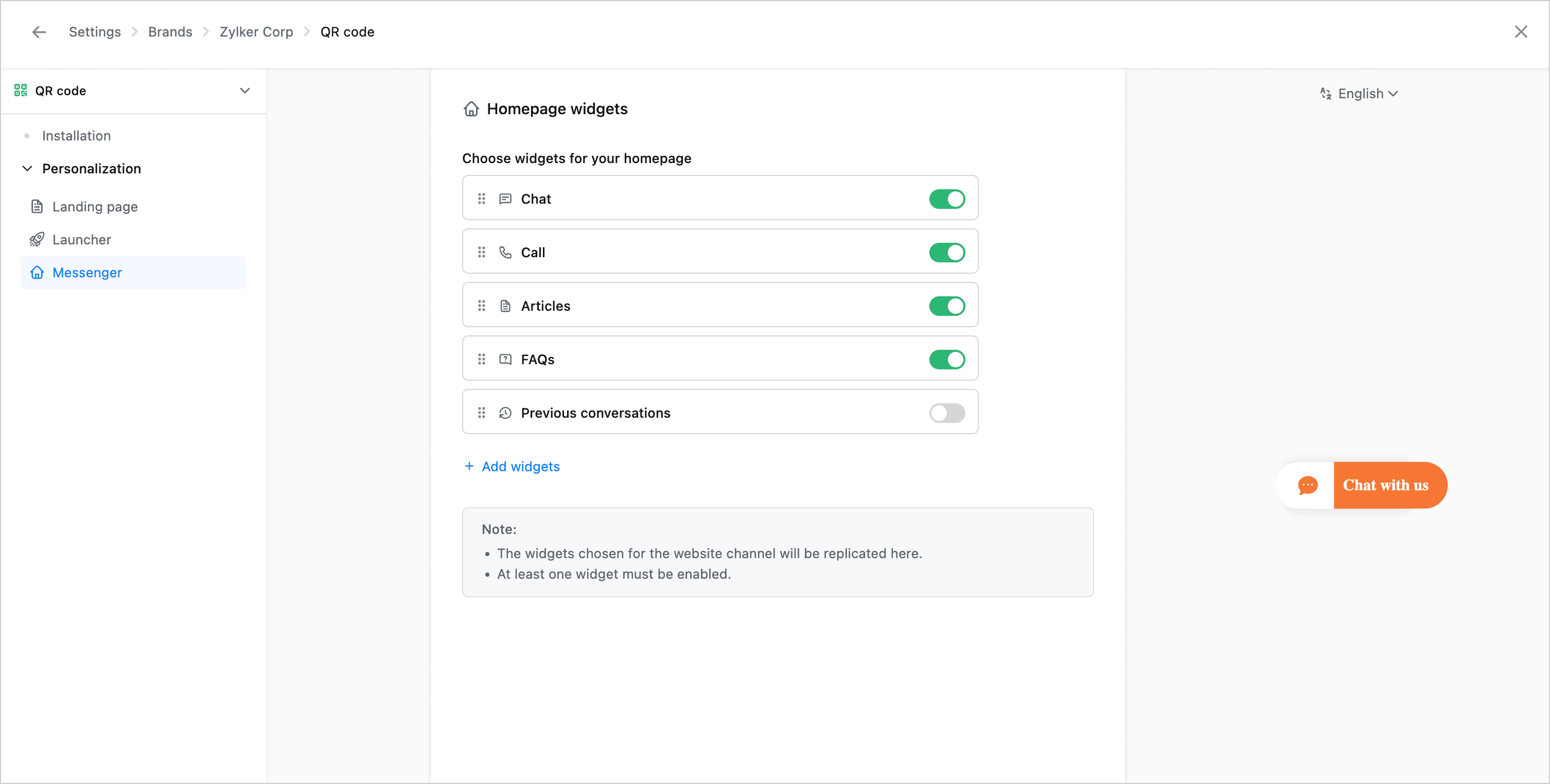 - By default, the widget configuration from the Website channel is applied here. You can review this setup and make adjustments if needed for the QR code experience.