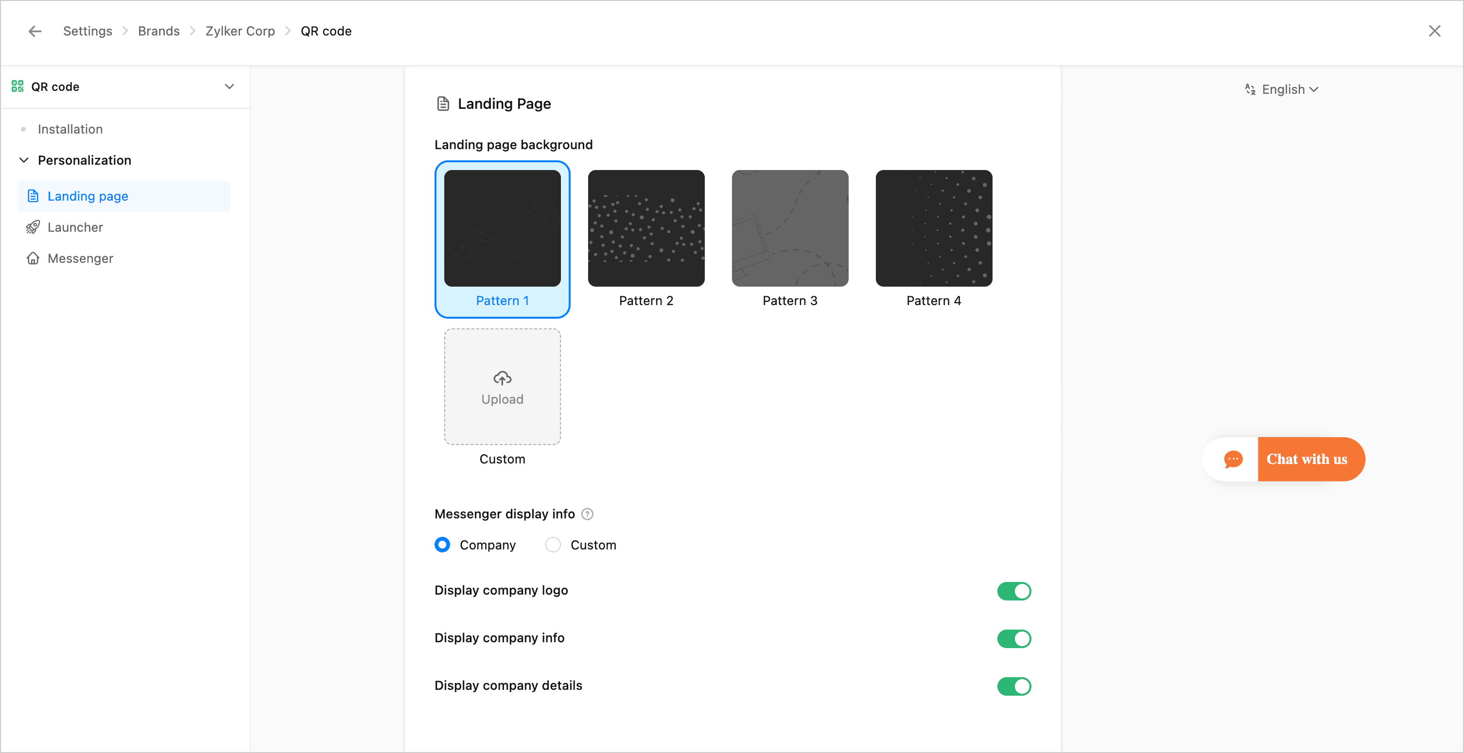 The Personalization section lets you customize how the QR code chat experience looks and feels for visitors after they scan the code. These settings help you control the appearance of the landing page, launcher, and messenger so the experience aligns with your brand.