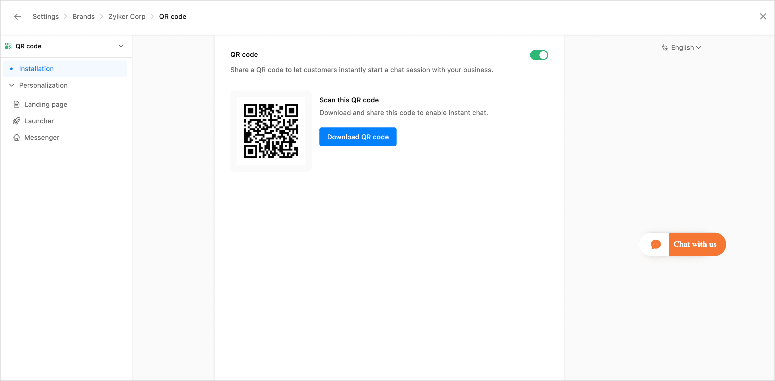 This section lets you generate and download a QR code that customers can scan to initiate a chat session with your brand.