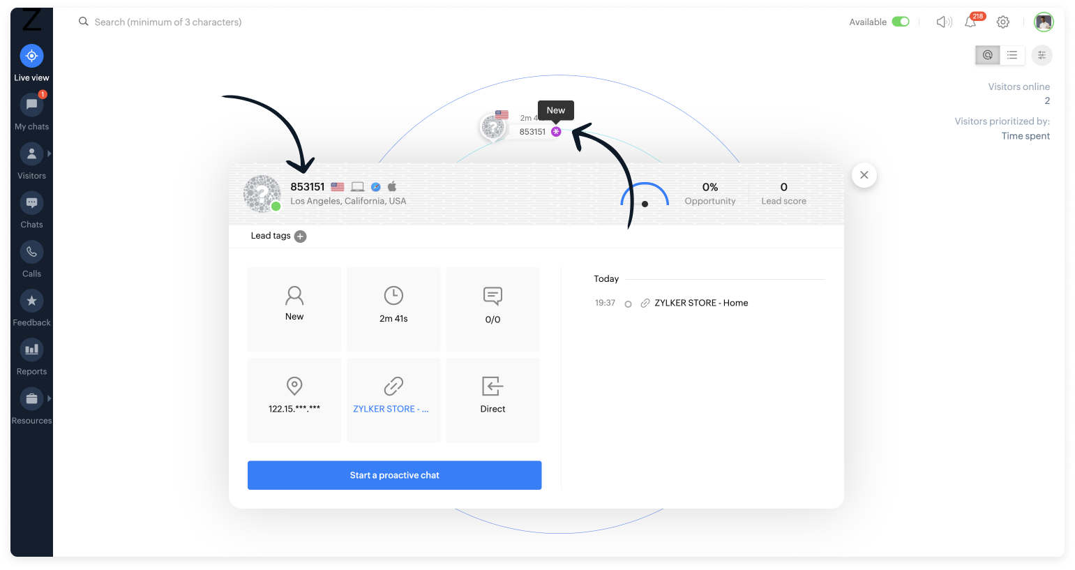 If the visitor doesn't fall under any above categories and visits the website for the first time, SalesIQ assigns them a random Visitor ID until they provide their details. Once visitors sign up for a chat and provide particulars in the chat widget, they will be identified with their registered name. If the visitor leaves the website without giving their details, then SalesIQ will identify the visitor with the random Visitor ID when the visitor visits again. A small Asterisk (*) will be mentioned near the Visitor ID that denotes the repeated visitor. The operator can also update the visitor information manually while engaging with them.