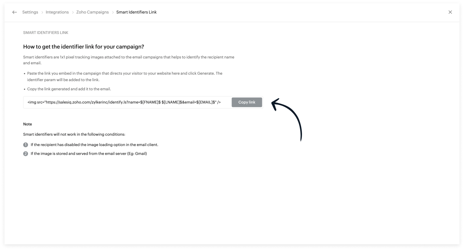 The Smart Identifier is the 1x1 pixel that will be sent in the email to track the visitor's identity who is accessing the email. This will set a cookie in the visitor's browser, using which SalesIQ can identify the recipient by name and email when they visit your website in the future.