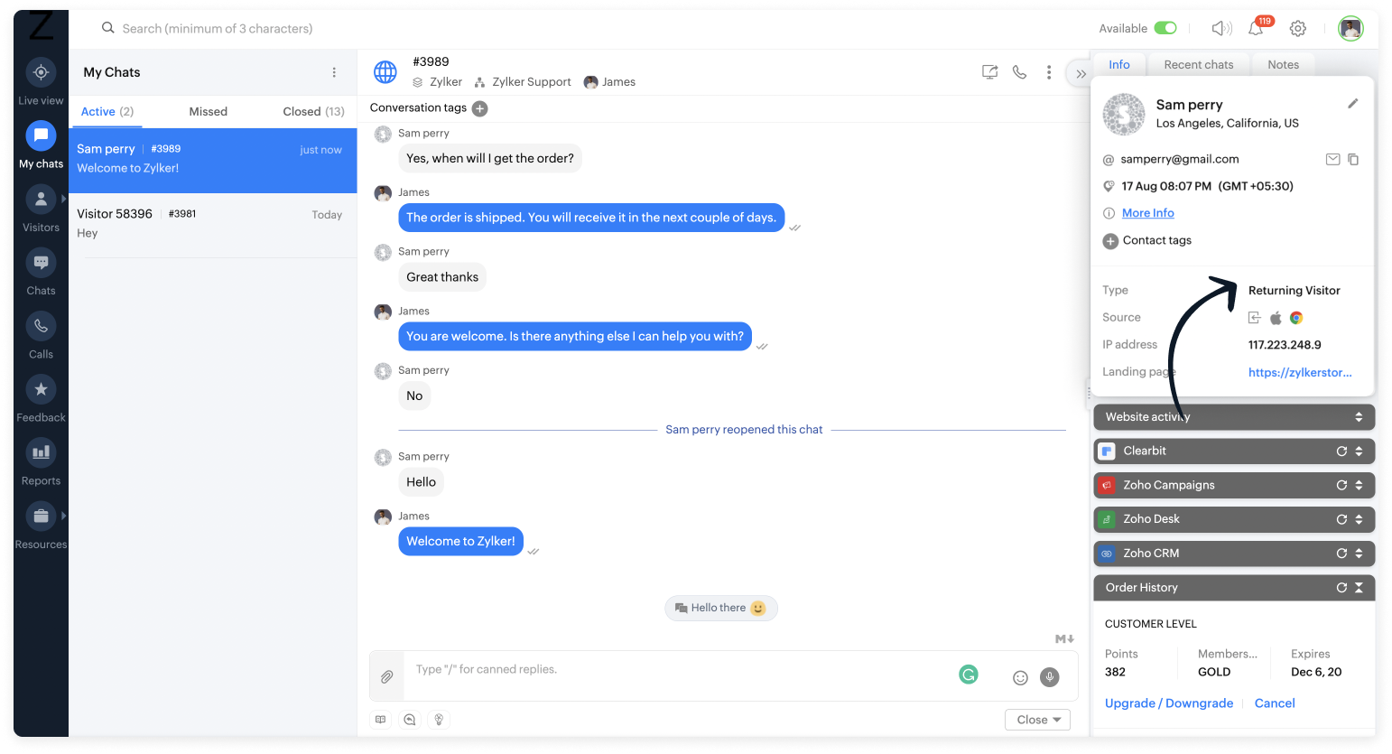 Using the information provided during the prior chats and visits, SalesIQ can identify the visitor by their registered name and email when they revisit the website. SalesIQ will assign the identity passed to the JS API for the visitor and remember it when the visitor revisits the website from the same browser. A unique key representing the visitor will be stored in the browser cookie using which the SalesIQ will remember the visitor.