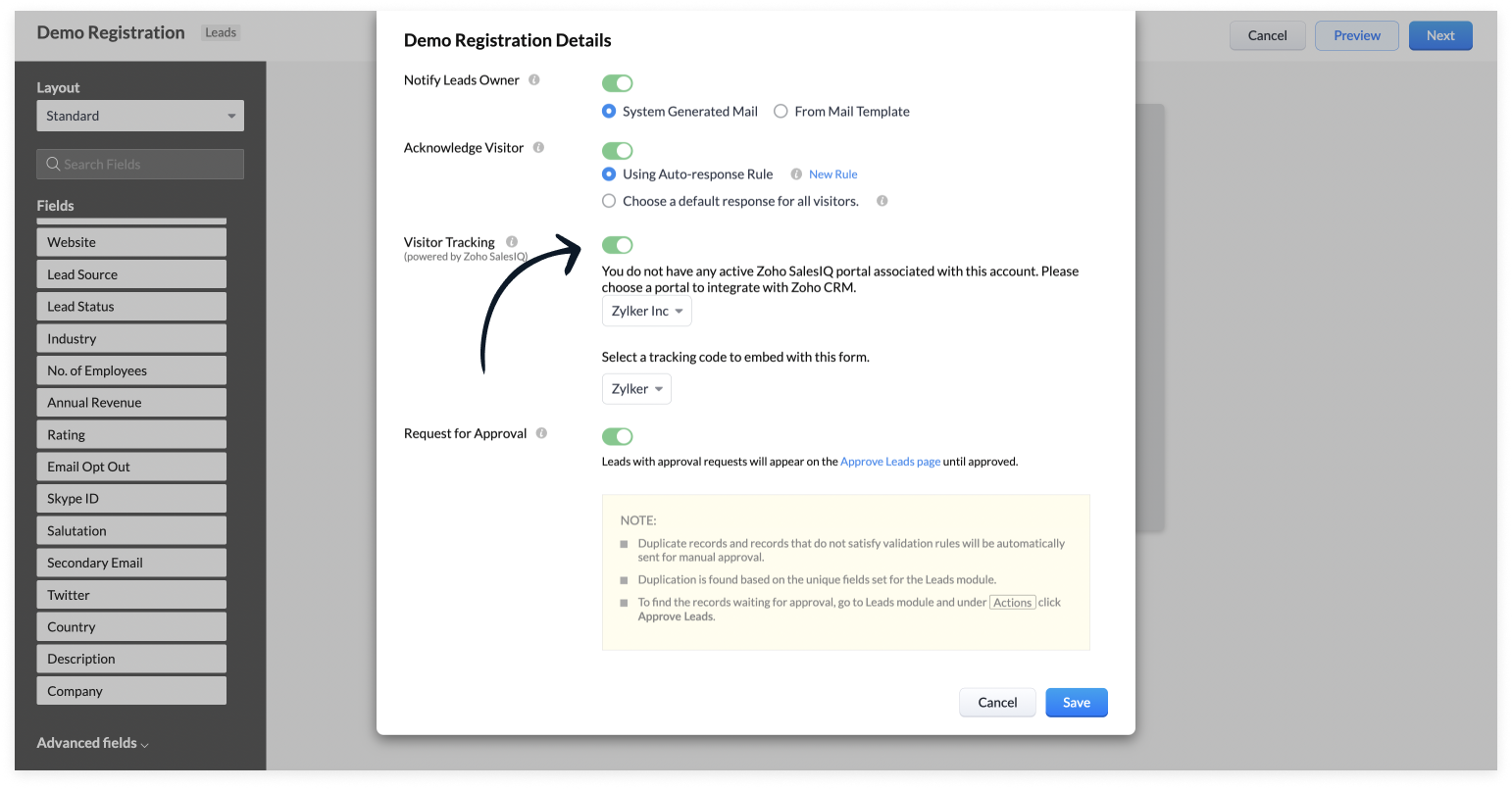 SalesIQ can identify the visitors only if the Visitor Tracking option is enabled while creating the CRM web form. If you have already added the web forms on your website without enabling the visitor tracking option, then enable the "Visitor Tracking" and update the web form code on your website.
