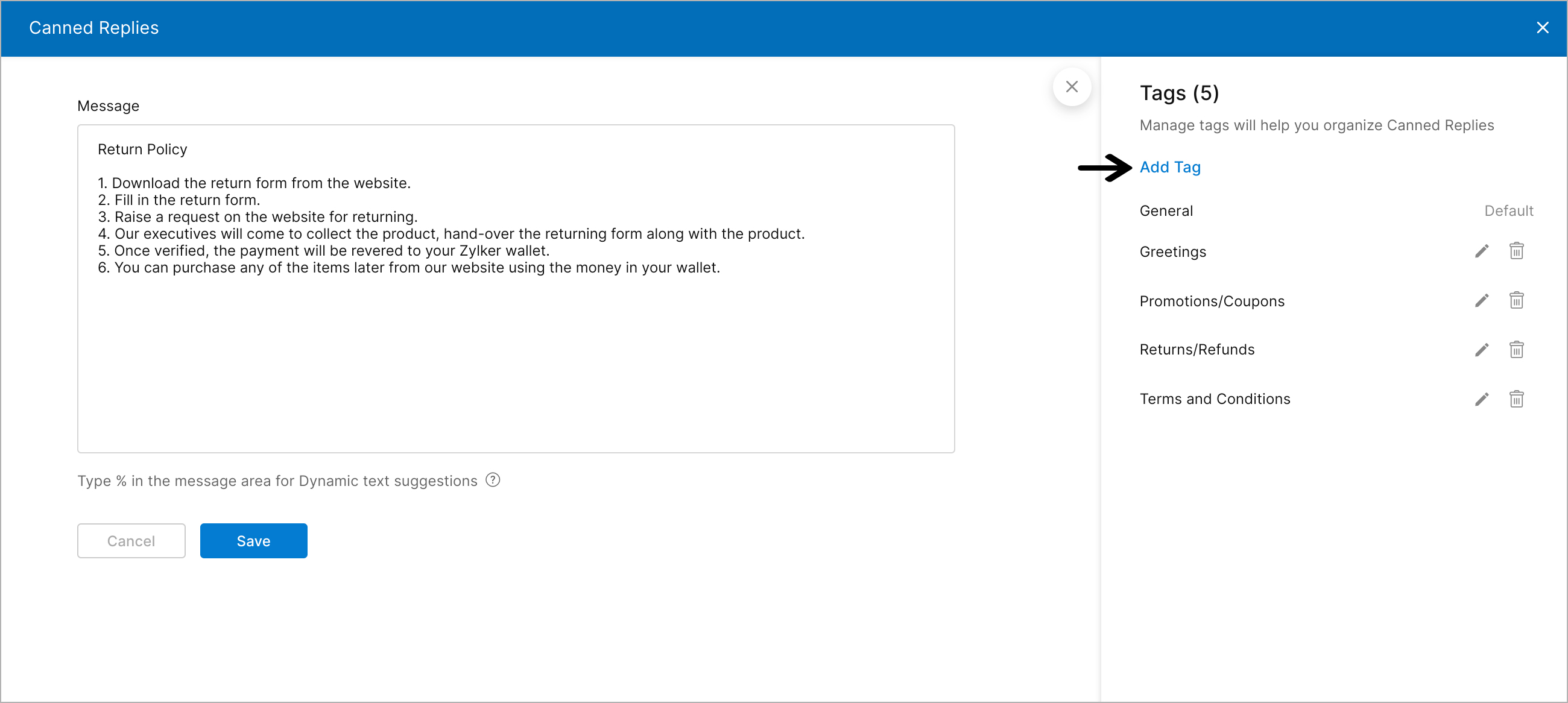 - You can choose a tag from the existing list or create a new one by clicking on Manage Tag . Each canned reply can be mapped to a maximum of 3 tags.