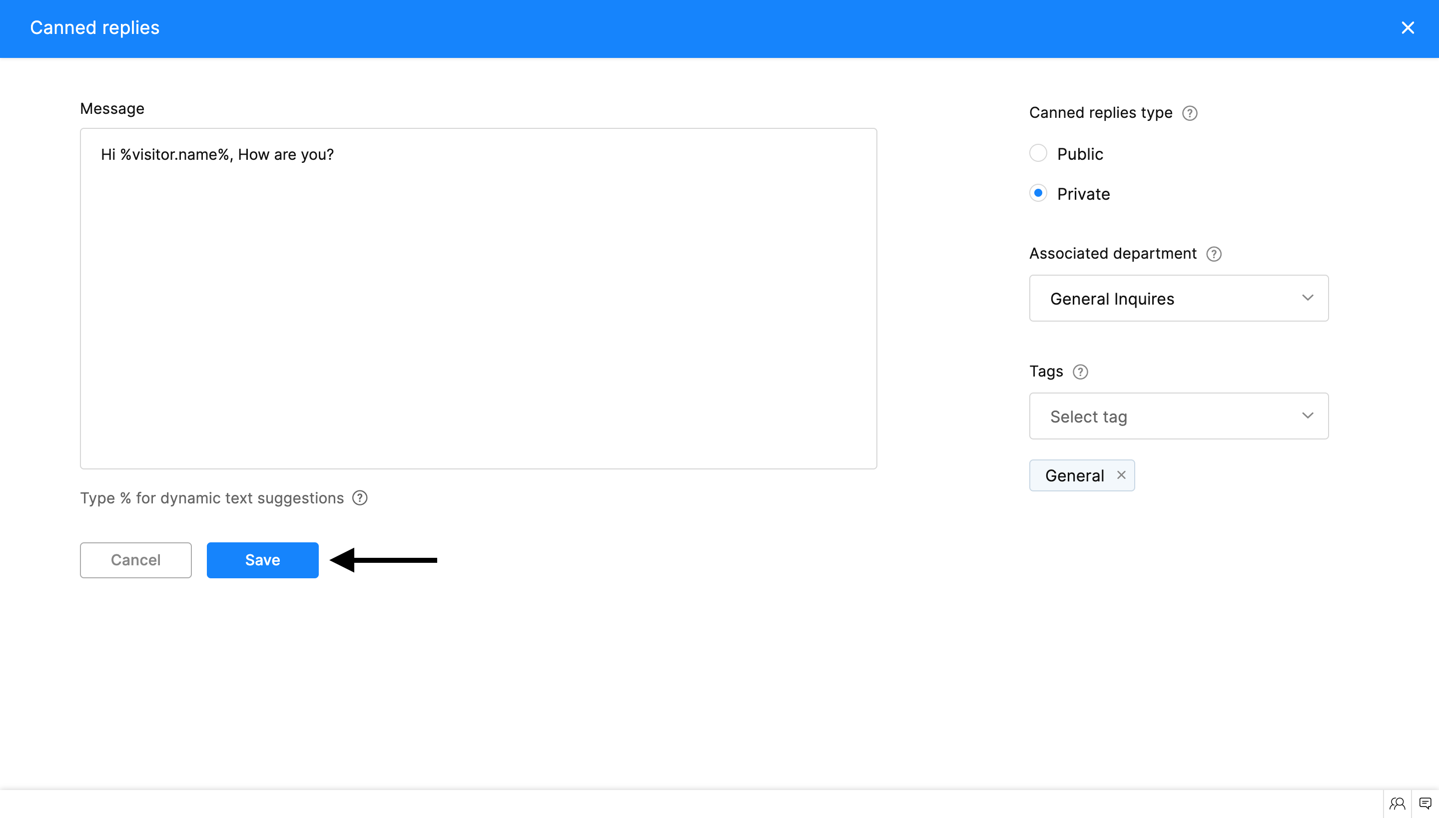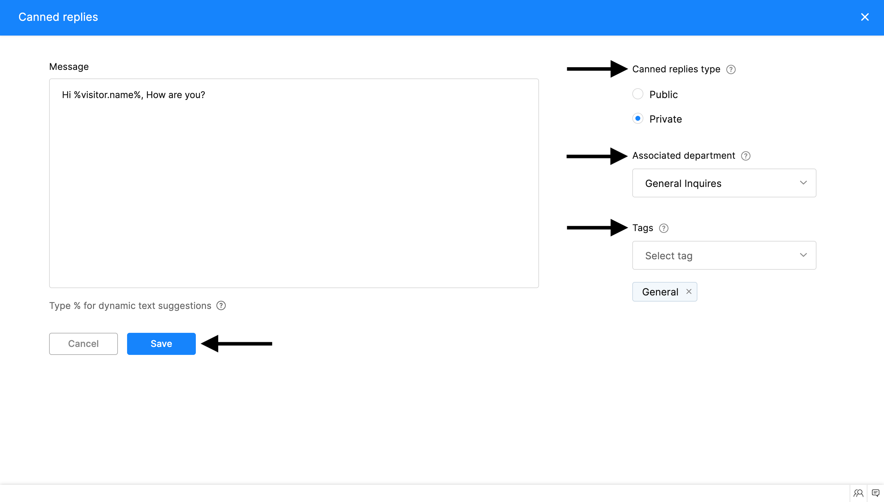 - Type the desired content in the Compose Message box. You can add dynamic text in the canned reply. When you type '%', you will be able to see all the different dynamic text that can be used in the reply and you can choose one from the list.