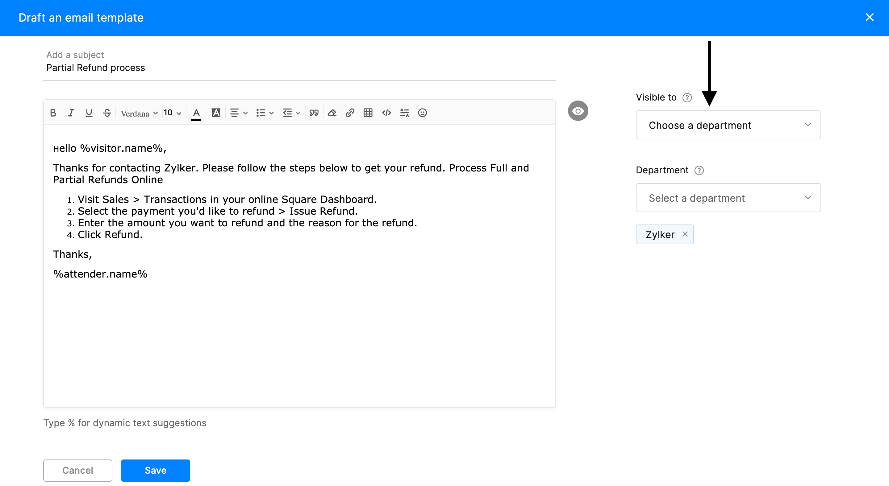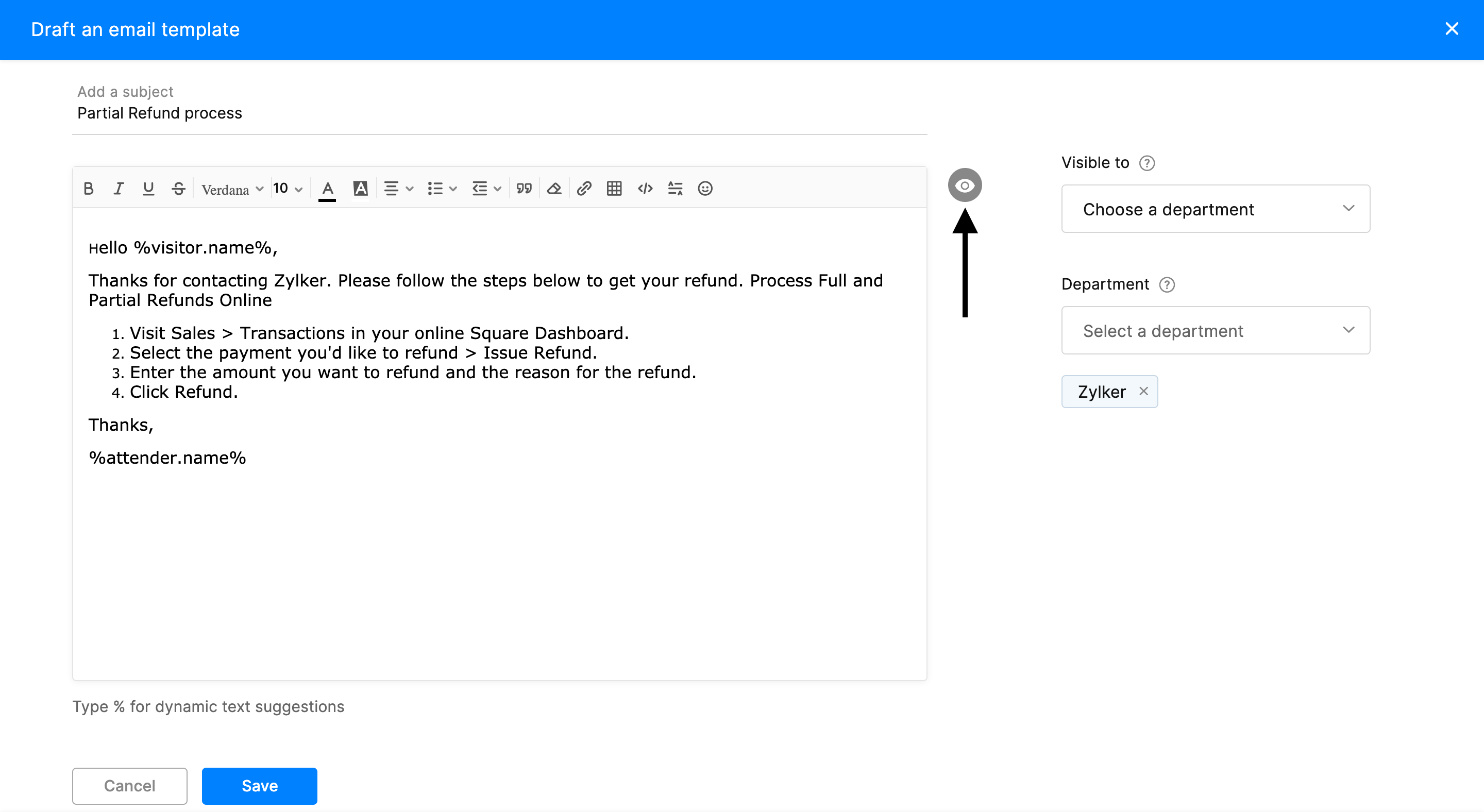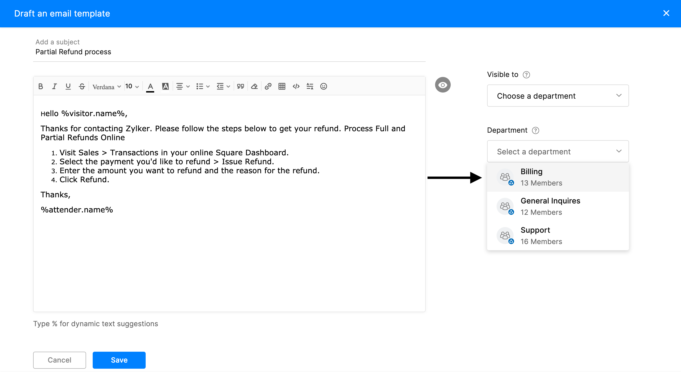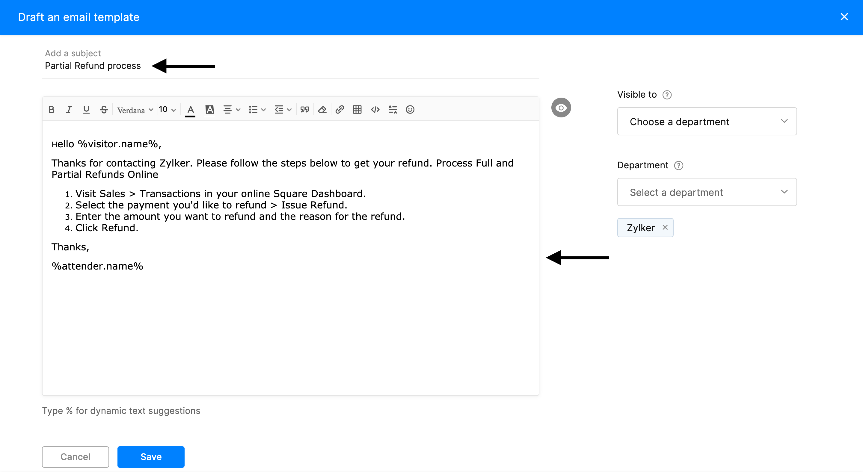 - Type the desired content in the Compose Message box. You can add dynamic text in the canned reply. When you type '%', you will be able to see all the different dynamic text that can be used in the reply and you can choose one from the list.