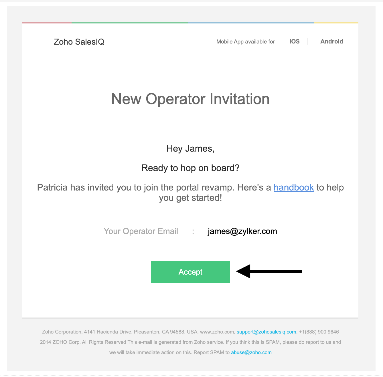 - Once you receive an invite to join a SalesIQ portal on your email, click on the Accept button