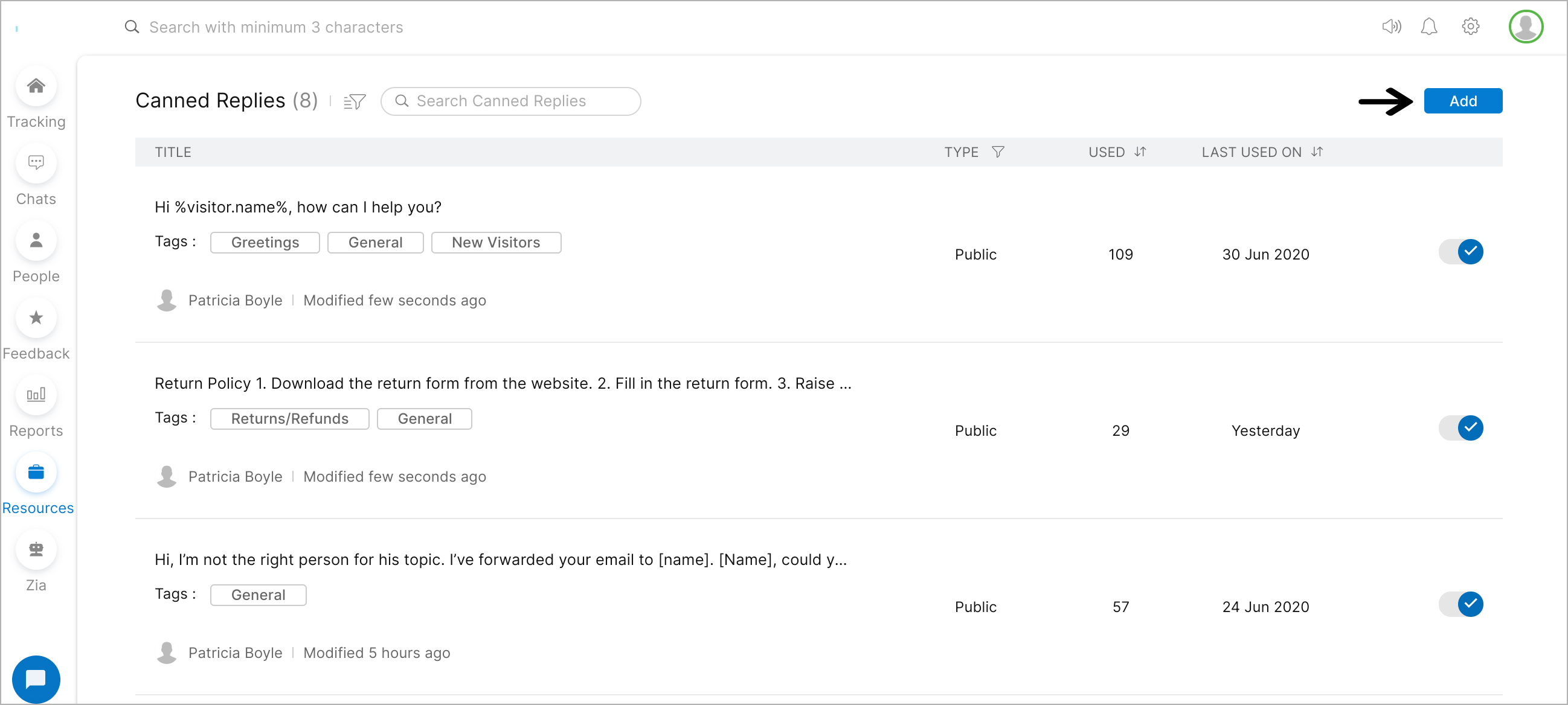 - In your SalesIQ dashboard, navigate to Resources > Canned Replies. You will land on the Canned Replies dahsboard.
