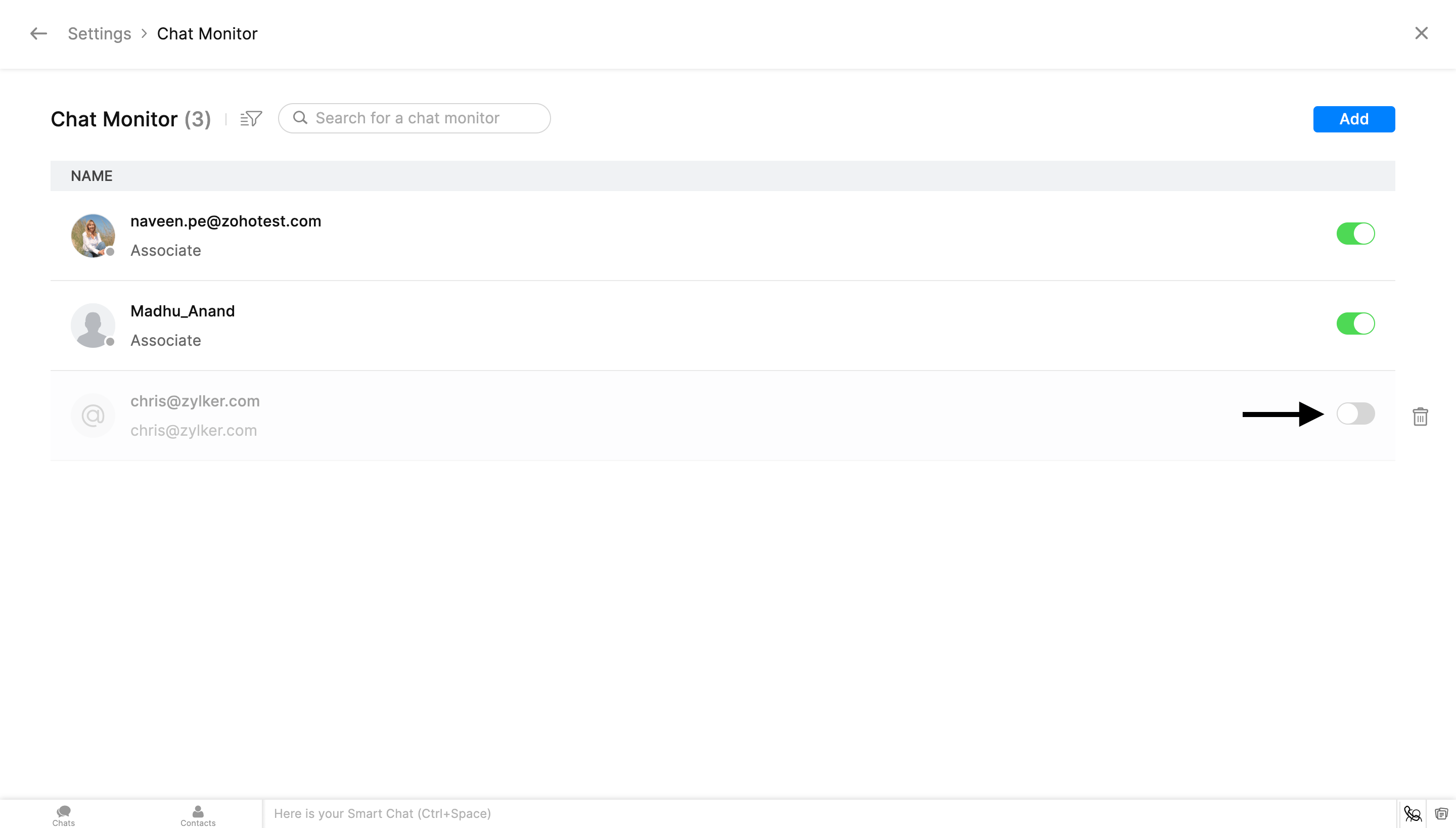 - After adding, you can view and manage all the Chat monitors in your portal. Click on the toggle to enable or disable a chat monitor.