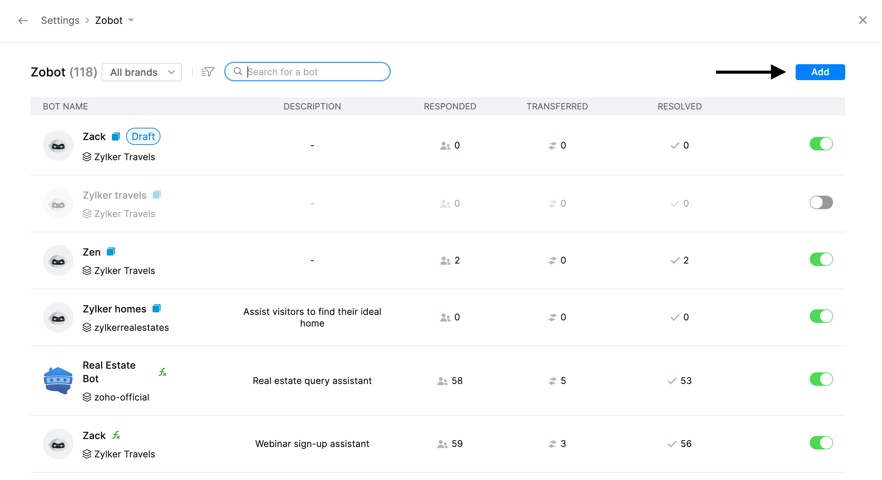 - To create a new Zobot navigate to Settings > Zobots, and click Add on the top right corner.
