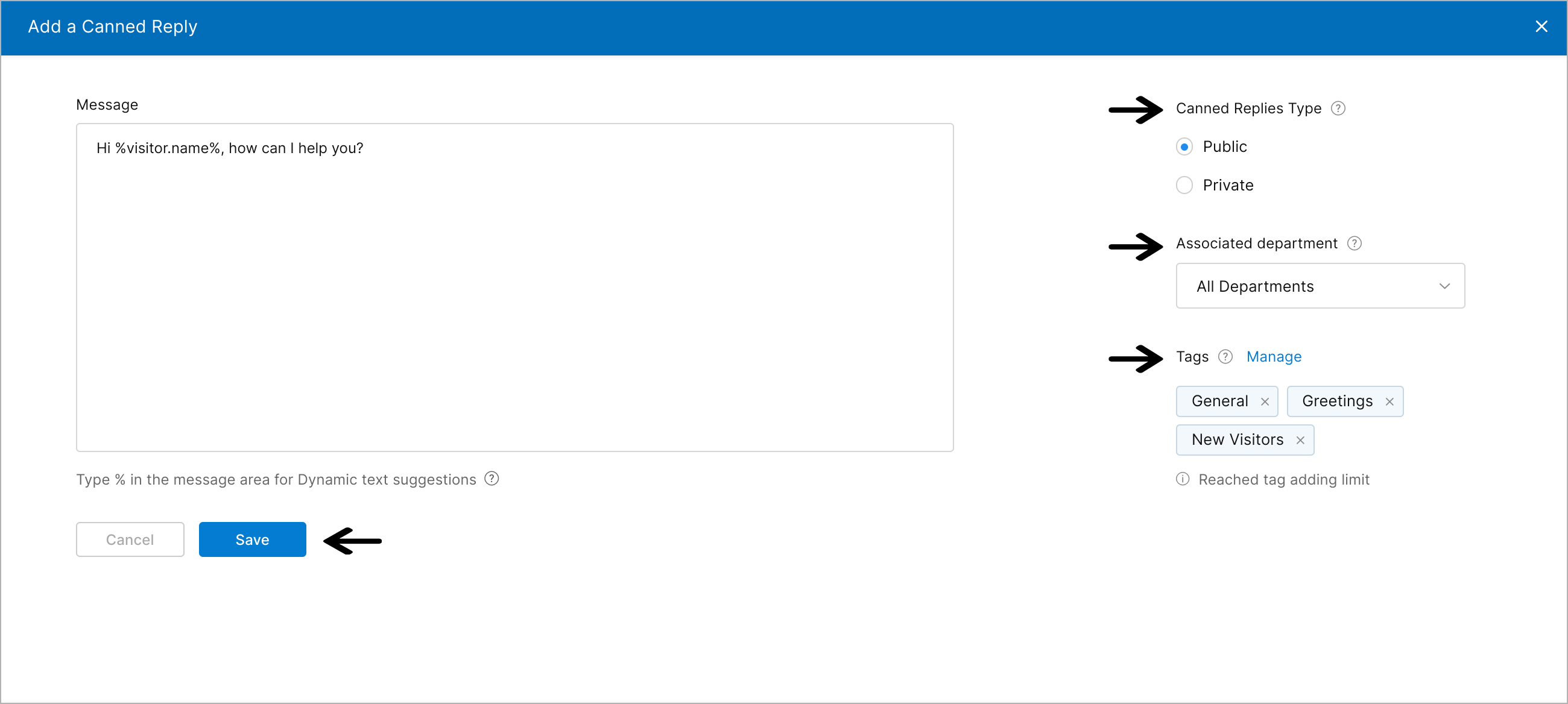 - Choose the department you want to associate the message with or choose All Departments for a general canned message that isn't department specific.