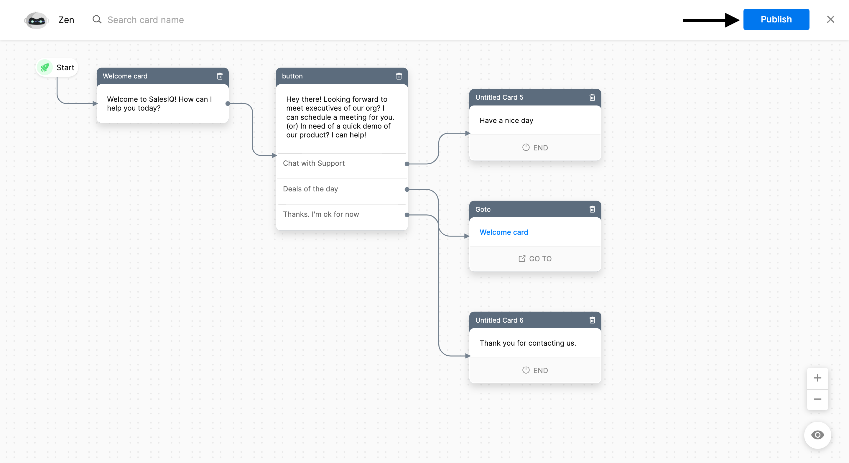 - After creating a Zobot for your requirements deploy it in your brands to engage with the visitors and assist them.