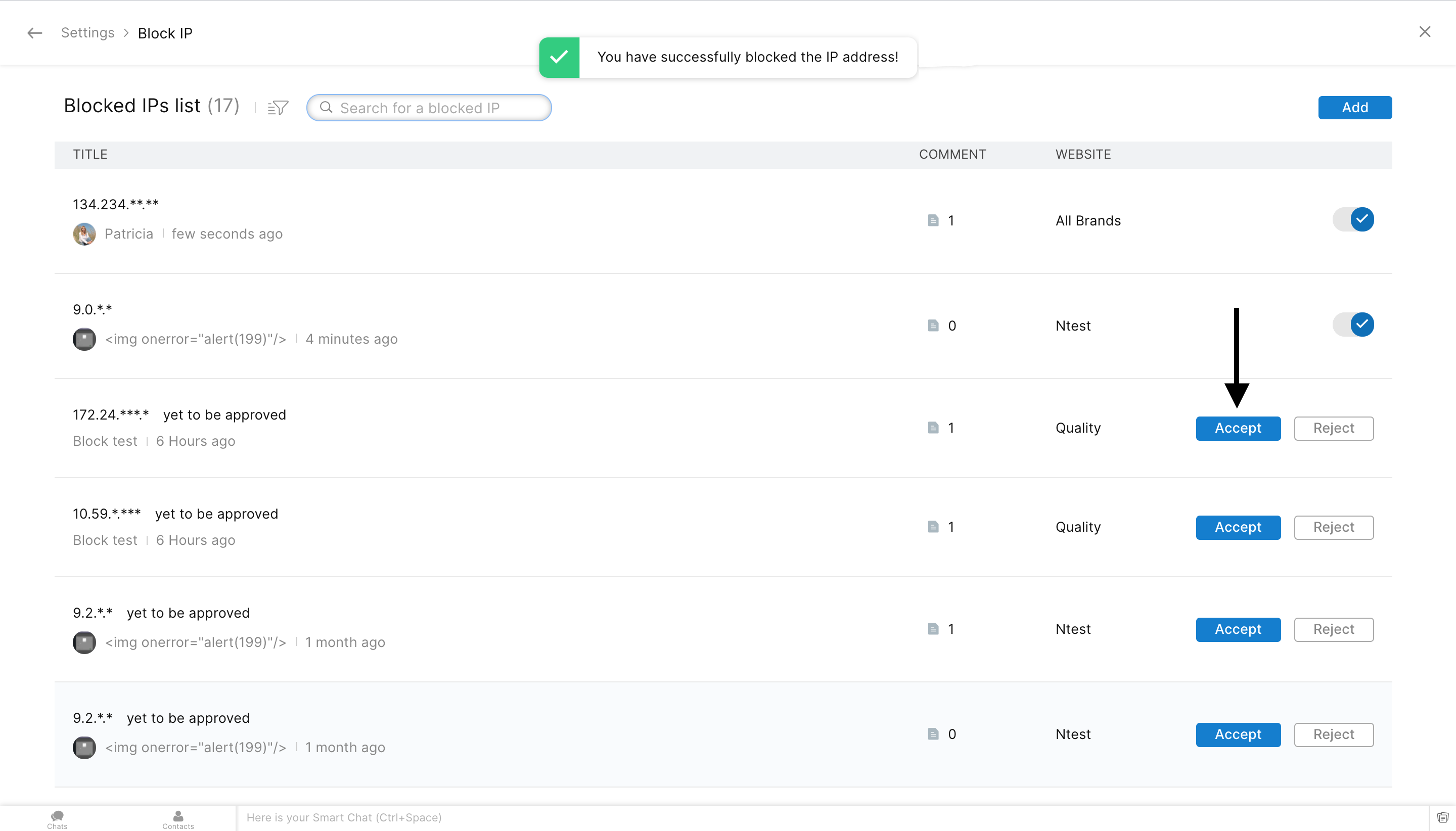It is important to validate the reason before blocking visitors. A supervisor can approve or reject any block IP request made by the operators to avoid unnecessary banning. Once an operator clicks the blocks IP option from the chat window. You can find the request by navigating to Settings > Blocked IP, and click accept.