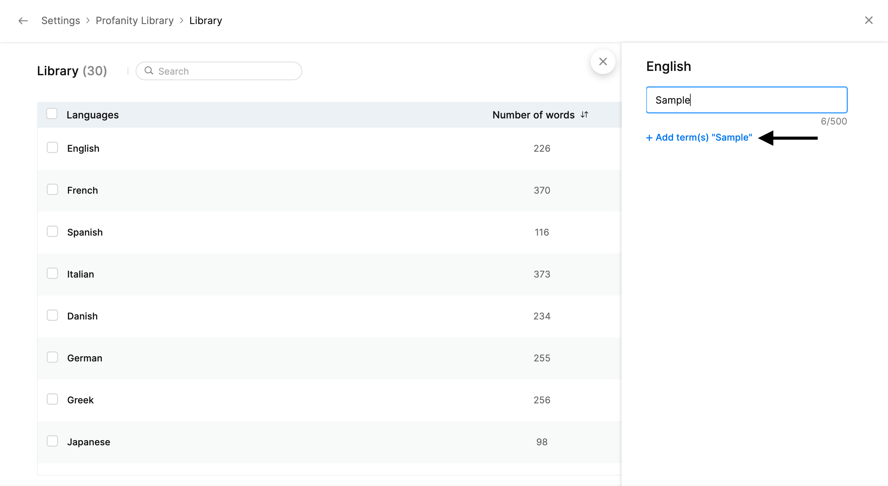- Type a new term and click the Add term option below the input field to add the term to the existing library.
