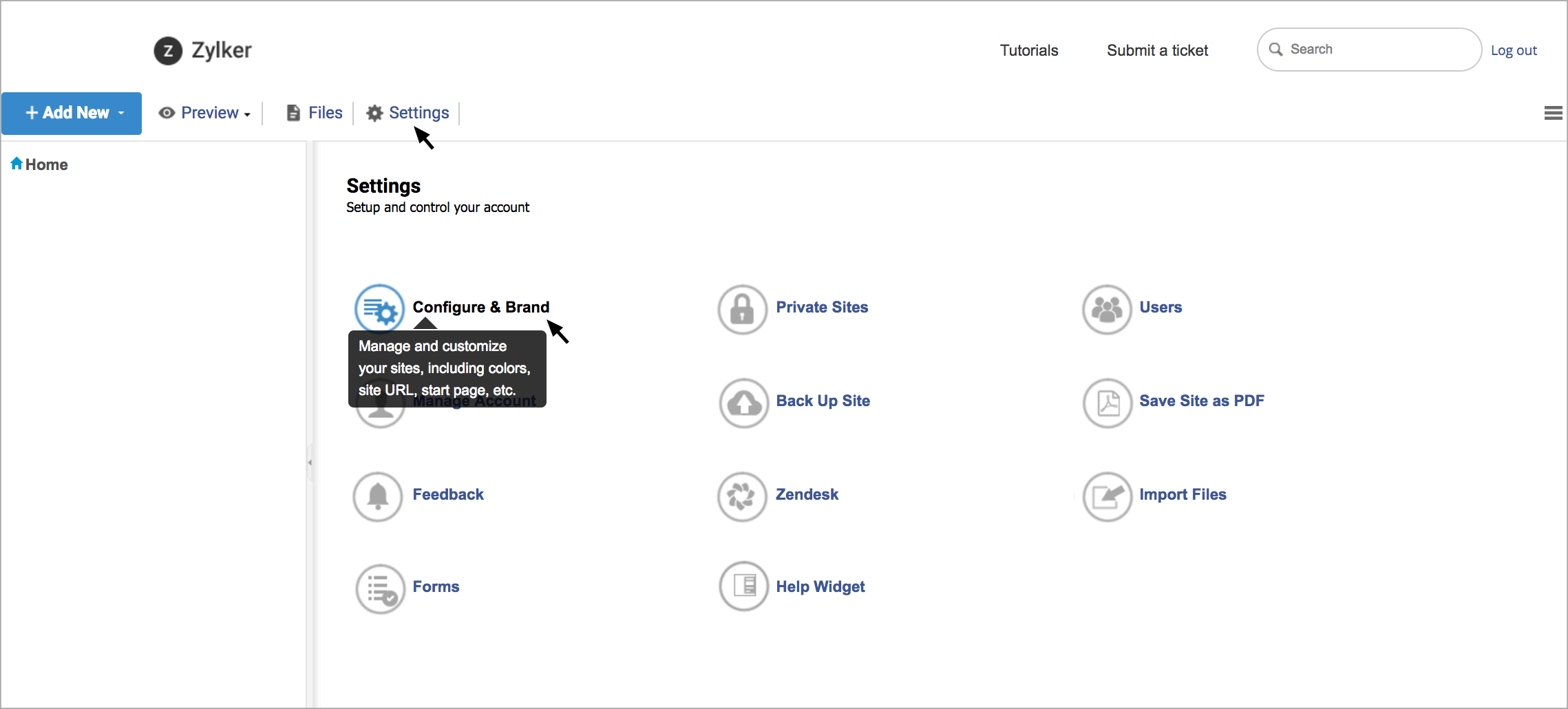 1. Log in to your ProProfs administrator account, select “Settings” tab and choose the “Configure and Brands” option.