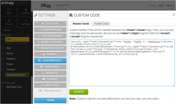 4. Paste your Zoho SalesIQ code in the Header or Footer section.