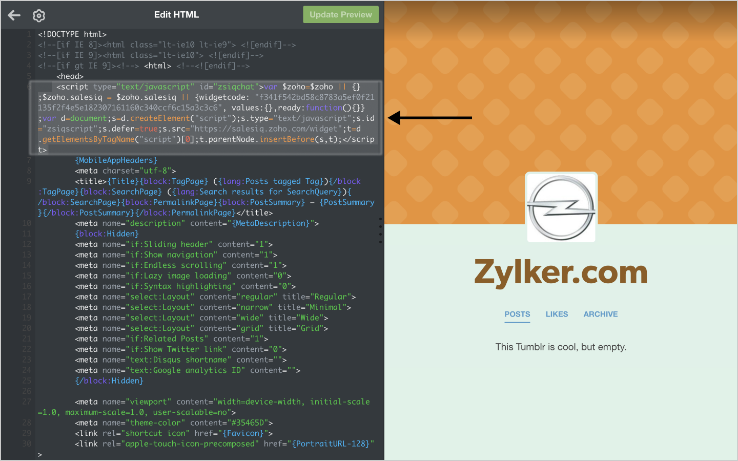 1. Paste the Zoho SalesIQ code between the "head" tags and click on Update Preview. Then click on "Save".