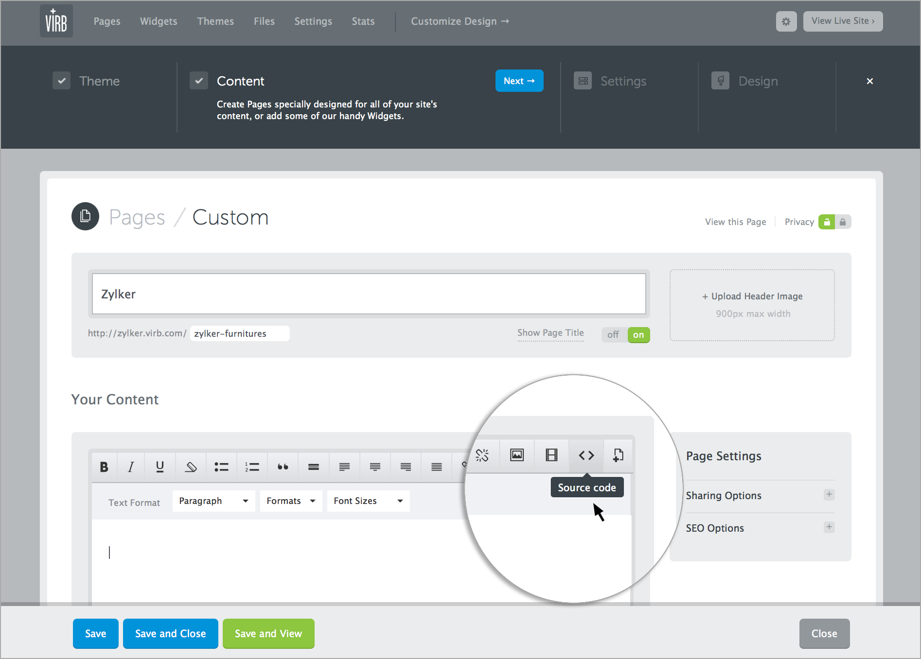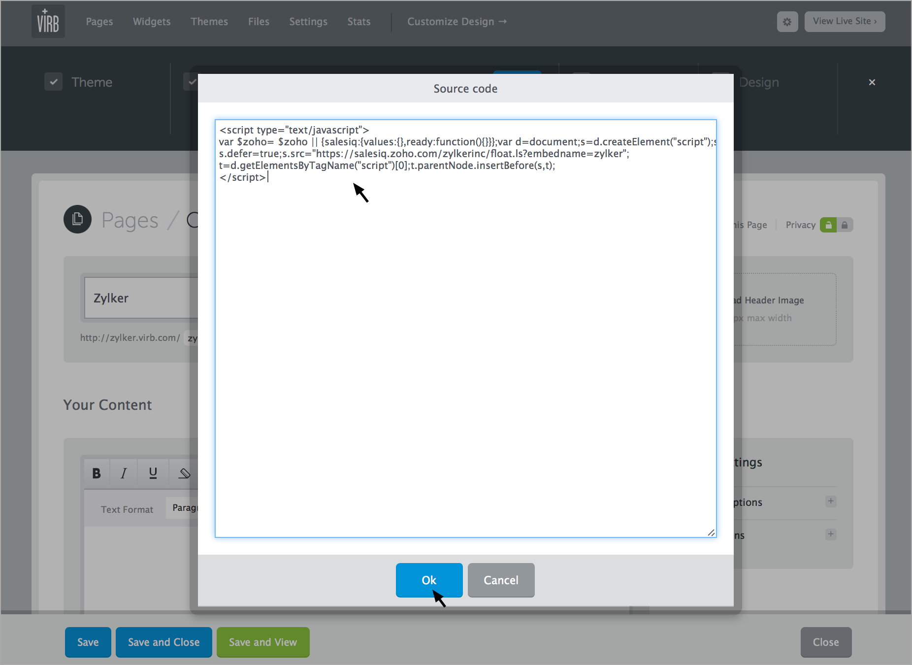 1. Paste the Zoho SalesIQ code snippet in the source code and "Save".