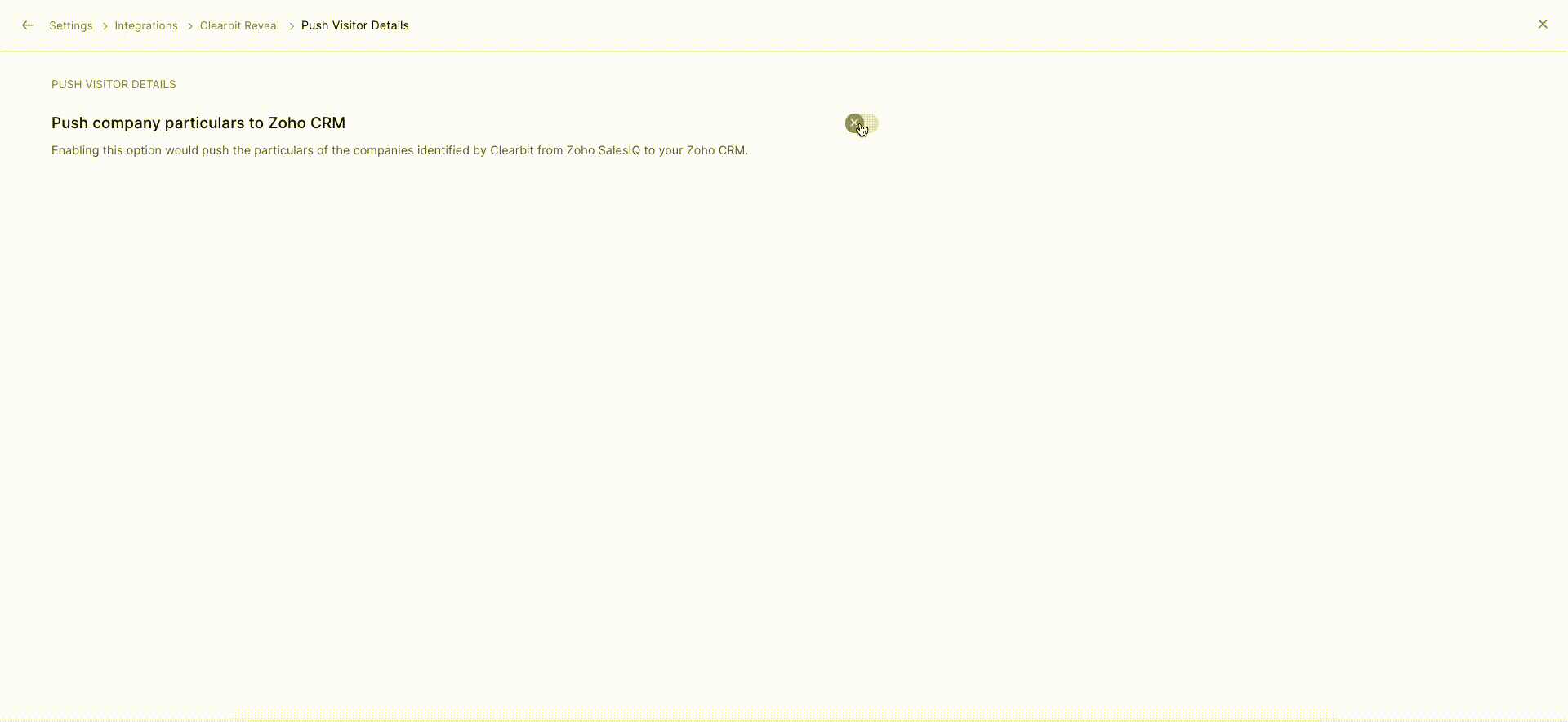 1. In Zoho SalesIQ, navigate to   Settings -> Integrations -> Clearbit (Reveal)  under  Business Intelligence, and click  Push Visitor Details to Zoho CRM.