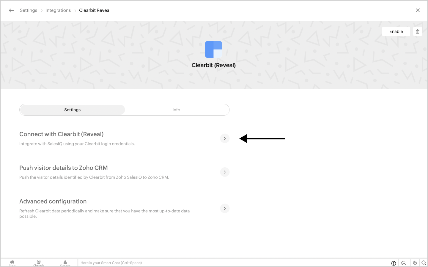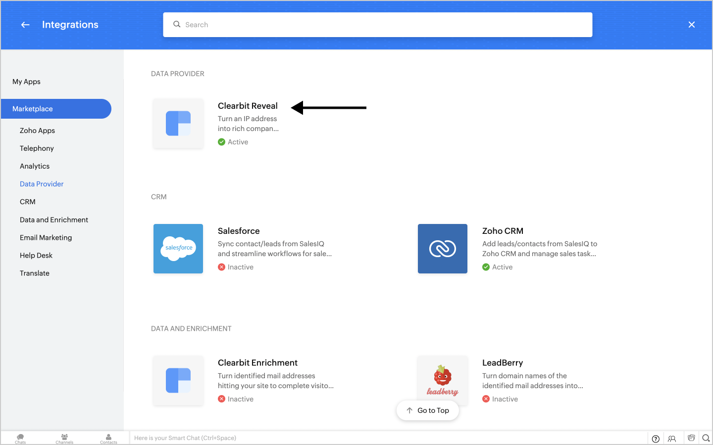 1. In Zoho SalesIQ, navigate to Settings > Integrations > Data Provider > Clearbit (Reveal).
