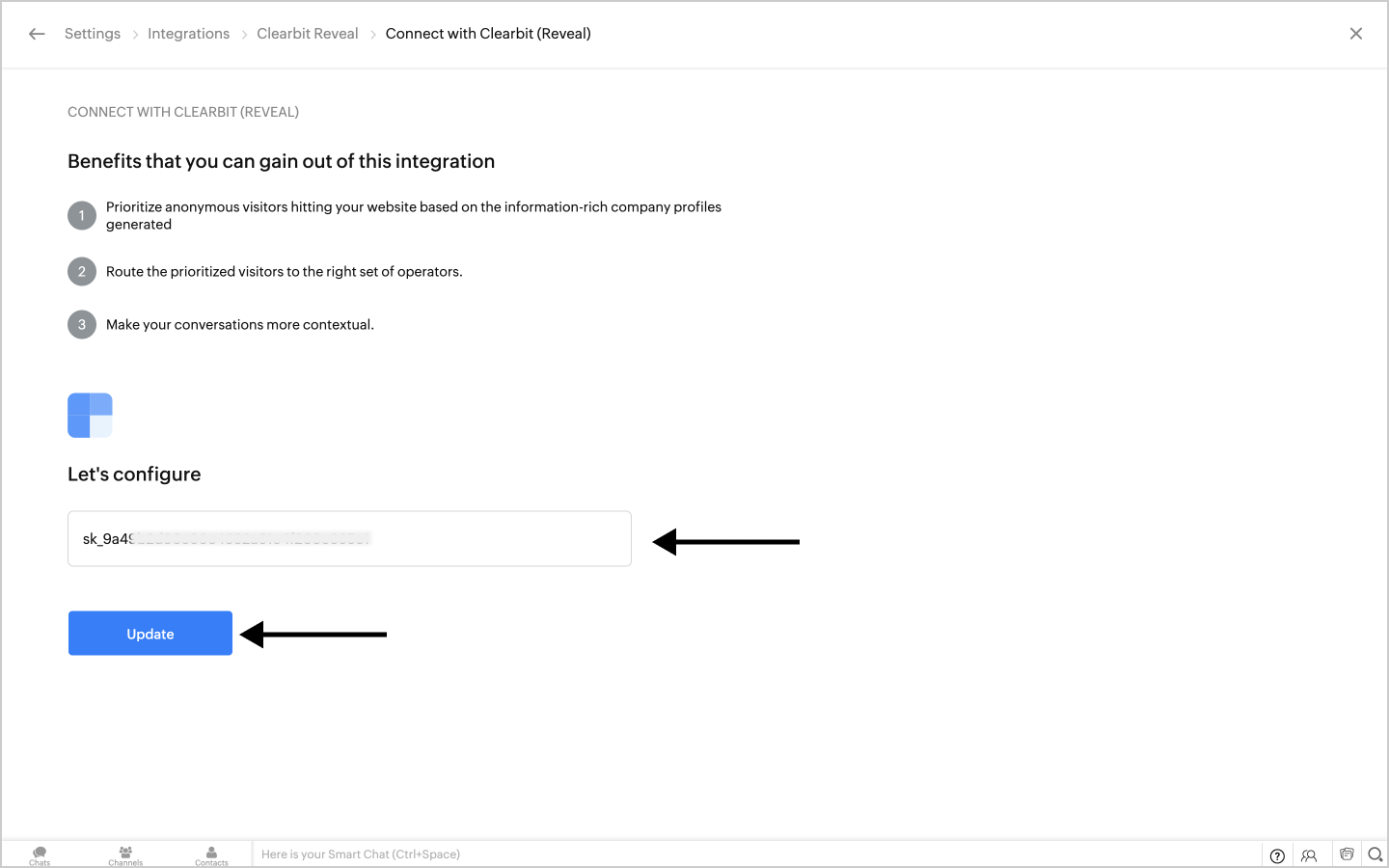 1. Back In Zoho SalesIQ, paste the Copied Key in the input field under  Let's configure Section.