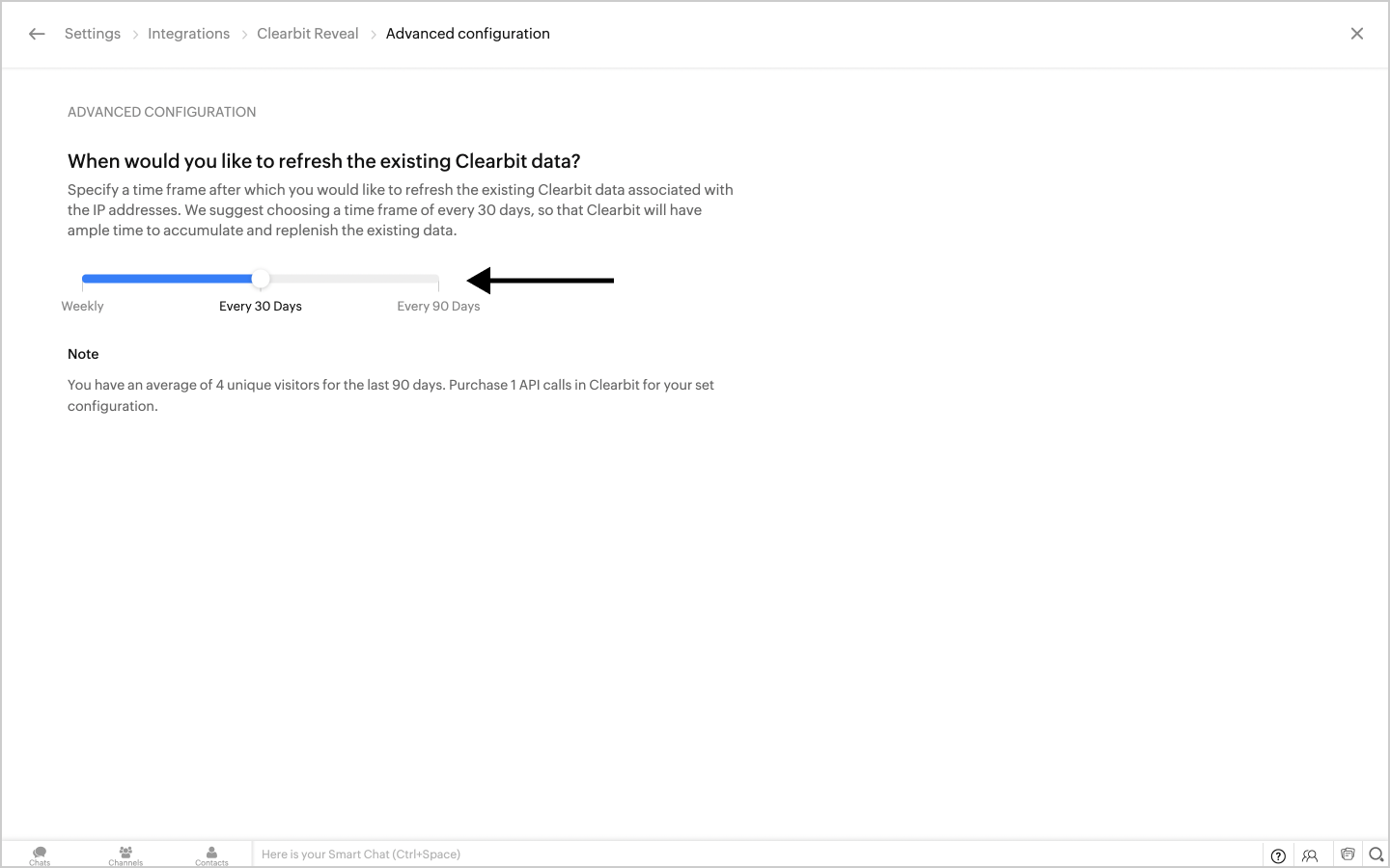 1. Navigate to Settings > Integrations > Clearbit Reveal (Under Data Provider) and then click on Advanced Configuration.
