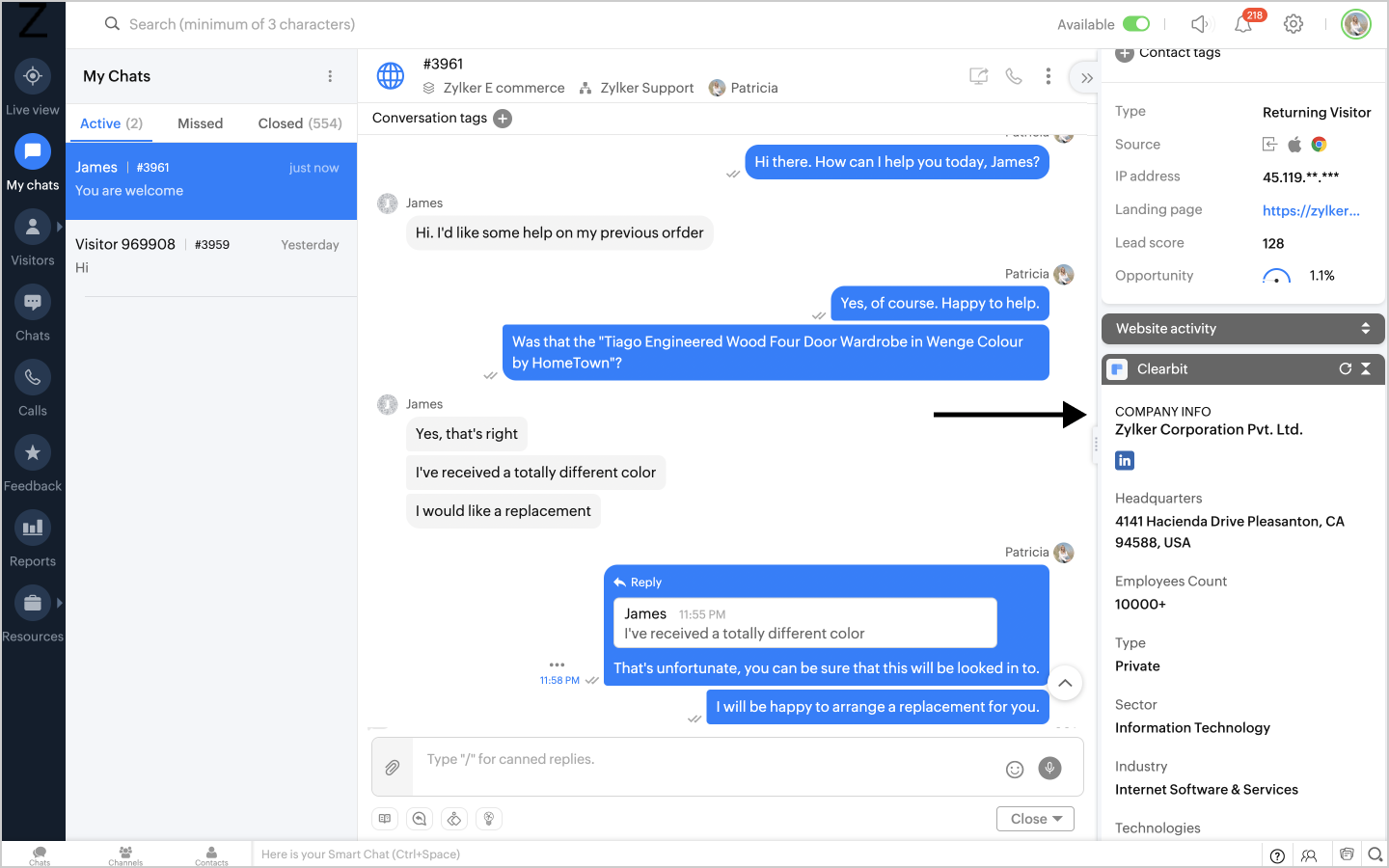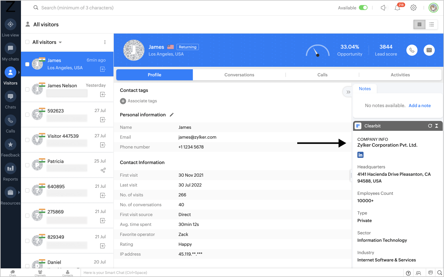 You can view the Clearbit details about the visitor such as Company information on Zoho SalesIQ on the Clearbit widget on the right side of the Operator chat window.