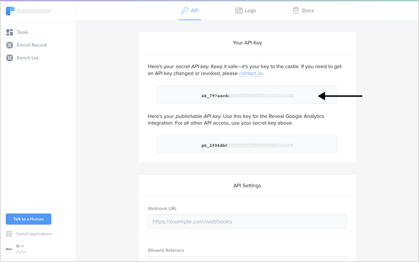 1. Then, Log into your Clearbit account, and navigate to the API tab. You will find two API keys, copy the first secret API key .