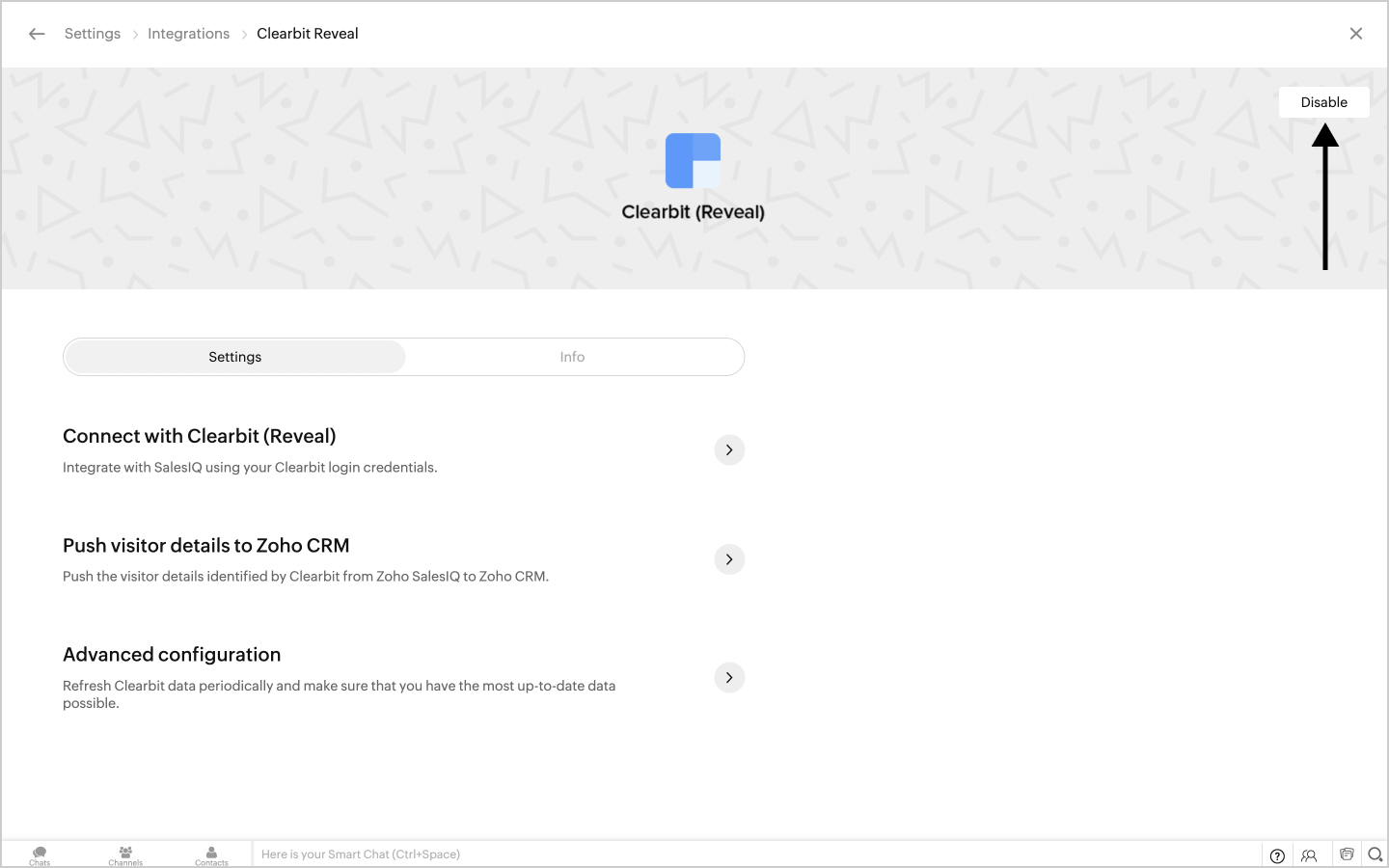 1. In Settings > Integrations > Clearbit Reveal, you can click on the Disable button on the top right.