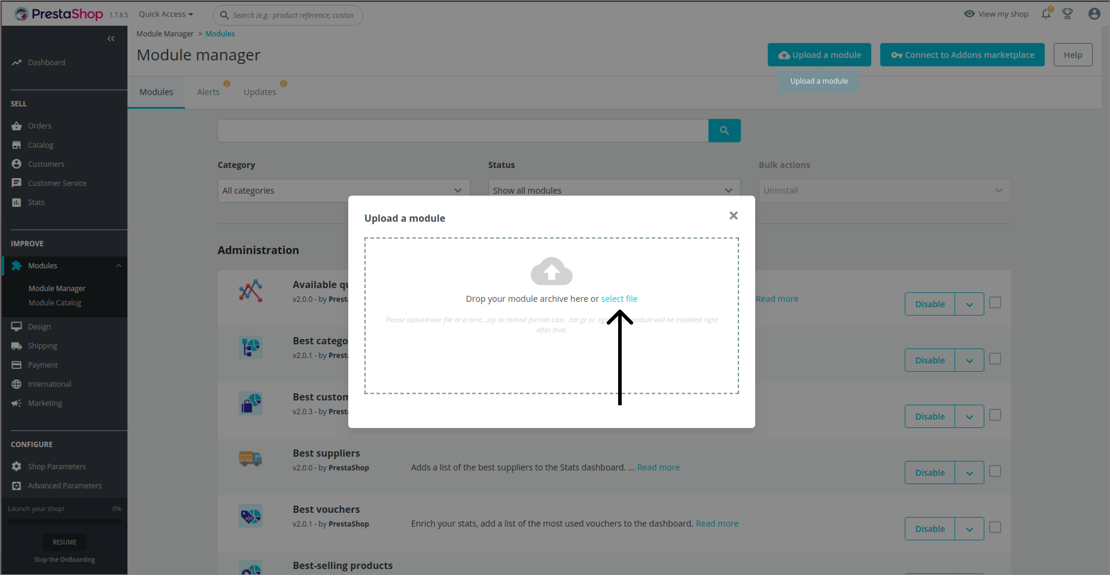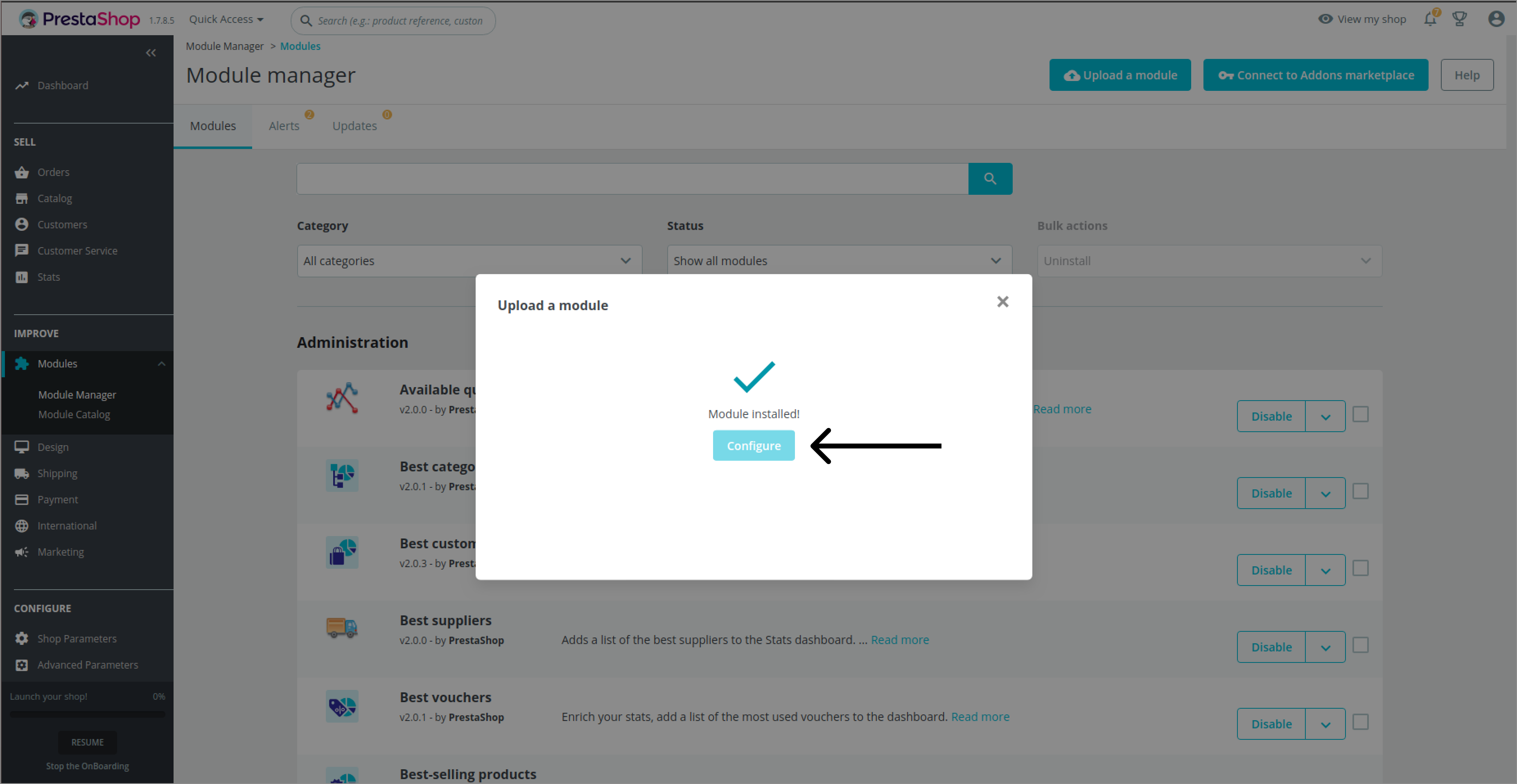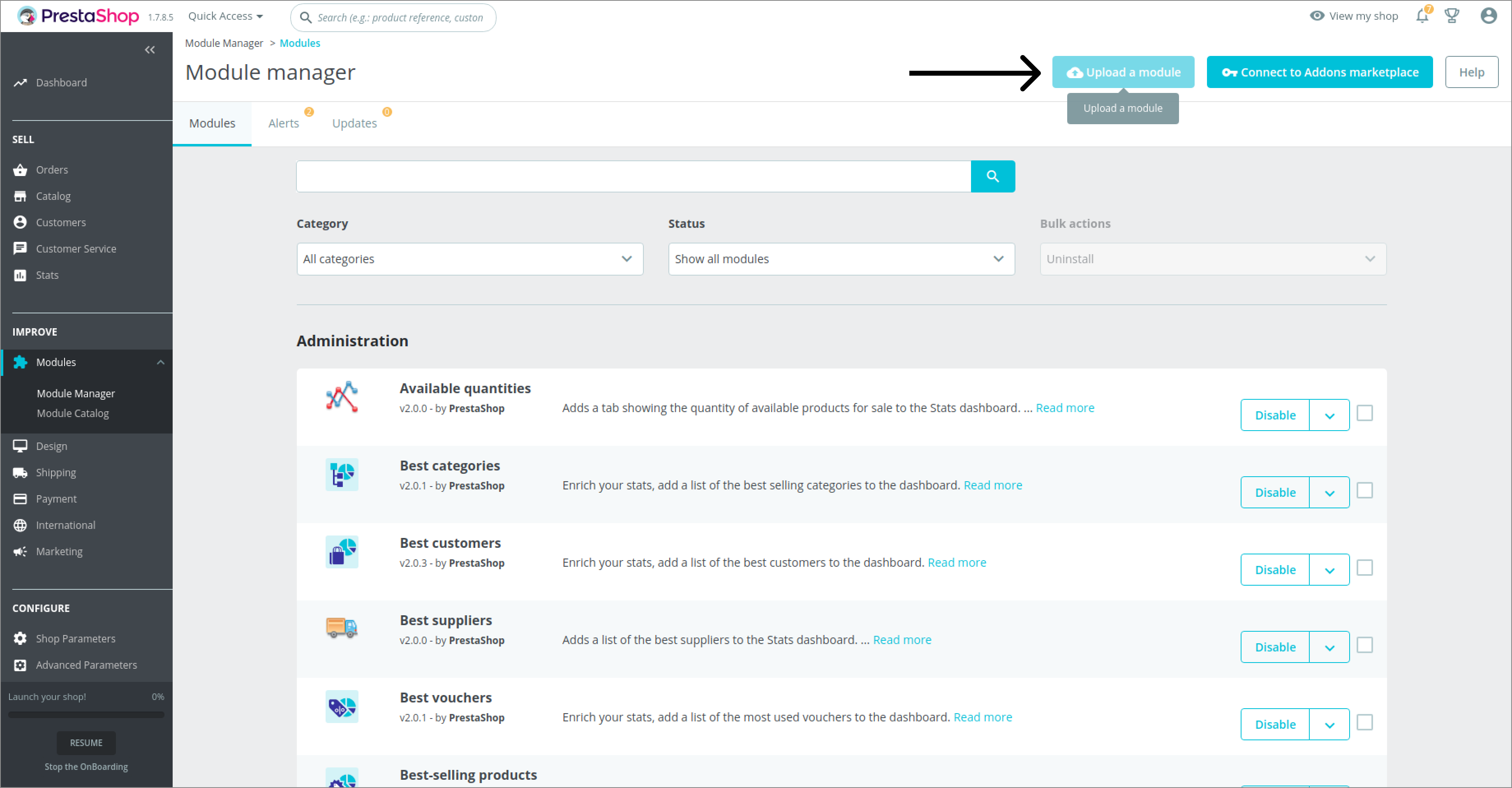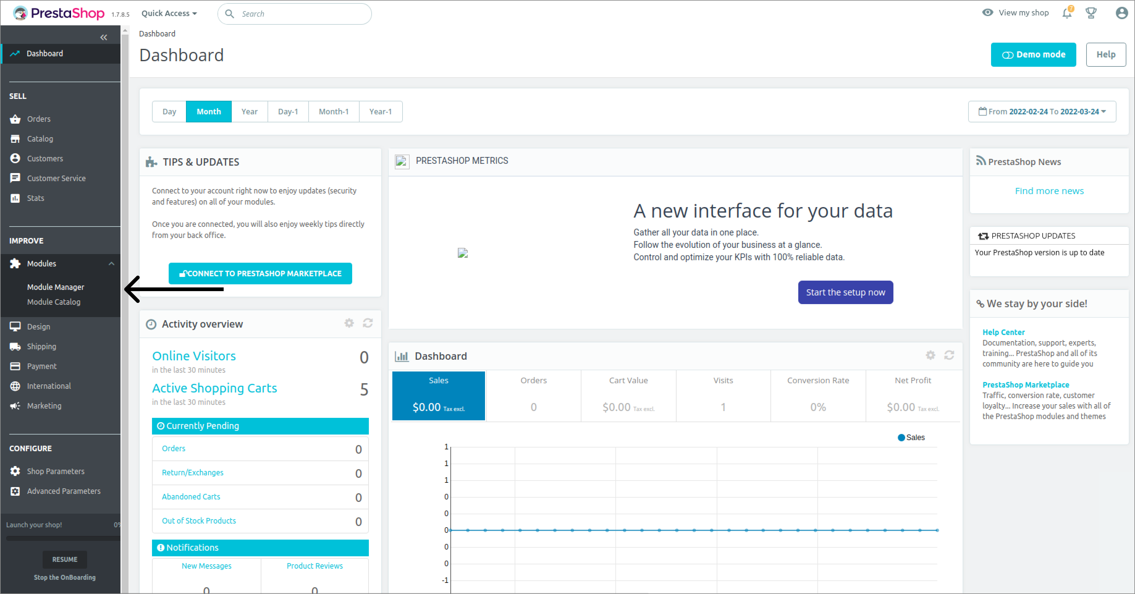 In the Prestashop dashboard, click on the Modules tab then select Module Manager.